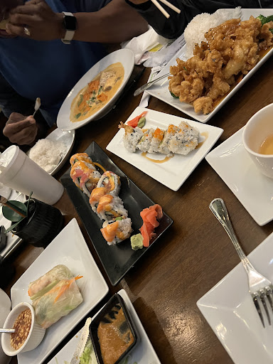 Now the atmosphere was everything you would expect in a Thai restaurant, but in a near minimalist level. The pictures and decor were simple and showed off the charm we think of from Thailand. They had little abstract sushi slices topped with salmon, tuna, and shrimp over the sushi bar.