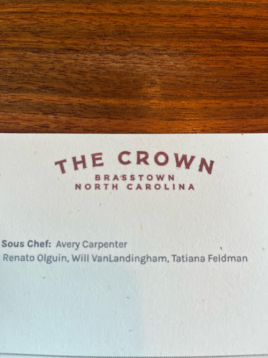 Read moreFantastic addition to the restaurant landscape in our area. The Crown truly delivers on their promise to bring 'innovative takes on traditional regional cooking.' First, everything our group ordered was delicious and we ordered a LOT...nearly one of everything on the menu. The small plates, which we made quick work of, were a refreshing assortment of flavorful recipes that consisted of locally sourced ingredients woven into thoughtful creations that shared traditional southern styles with inventive herbs and sauces all engineered to produce some truly unique flavors and dishes. Pakoras, for instance, a chickpea, sweet tater, and onion fritter beautifully fried to a crunchy crispness with a moist tender inside exploding with savory flavors (think of a hush-puppy that just won't hush). The appetizer size portions of the 'small dishes' are just enough to gear you up for the rest of the menu which promises to build upon the same creativity for your entree. Among our group, we had Stuffed Carolina Trout with Candy Mtn Farms (local) bok choy; Curry of the Moment which was a low heat green curry over super fresh veggies and rice and sided with a perfectly grilled chicken breast, yes, curry in Brasstown! where Appalachia meets spices from the East (India, not Raleigh); and the Comfort Dish dujour which was a meatloaf from local grass fed beef served with potatoes and the finest crispy brussels sprouts you will ever enjoy. We ate like pigs and I can’t go through all the individual dishes. Suffice to say, we all enjoyed everything about this new establishment starting with our arrival and realizing this place exists in Brasstown NC, to the vibe when you walk in and soak up the decor, to the impeccable service (thanks Emily!), and finally the food and wine selections. I've included some pictures with names of dishes if you’re curious to see the presentation, which is also world-class. Obviously I recommend this place if you love great food and an excellent...