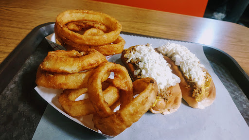The dogs were hot, and tasted great and fulfilling. The bun was a bit toasted and the slaw and chili were great. The onion rings were fresh, tasted great, not too done, not too light, they were scrumptious.
