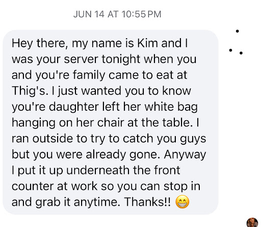 Those of you who know me personally know that I'm an emotional person. I definitely have my moments where I cry for just about anything. (This being one of those moments 🙄🤦🏽♀️😂) I normally don't check hidden messages on this app, but for some reason, I checked them this morning. It only shows a preview, so when I saw a “hey there”, I instantly thought this was one of those spam messages, but I clicked it anyway, only to find the sweetest message. Honesty is HUGE for me, so when I saw this woman took the time out of her busy night and probably a very long shift to send me a message to tell me that my daughter's pocketbook was left behind, it really touched me. 🥹❤️🫶🏽