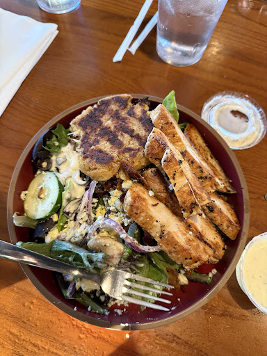 The Southern Cobb Salad was a hearty and flavorful option, with a perfectly grilled chicken breast elevating the mix of eggs, tomatoes, crispy bacon, black olives, cucumbers, red onions, and bleu cheese crumble. The combination of ingredients was well-balanced, creating a satisfying meal.