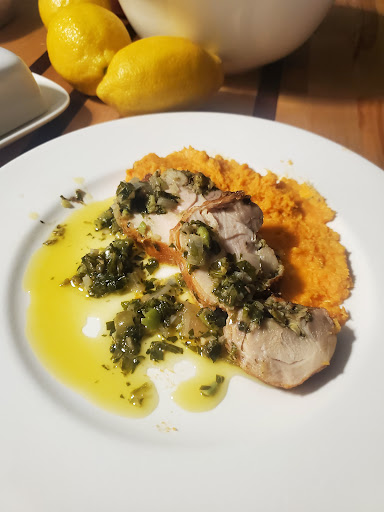 I bought the Chicken Roulade and the Chocolate Cake. (The sweet potatoes in the photos, I made at home.) Both were delicious, though the chicken had very little (actually no) stuffing oast the 1st two cuts.