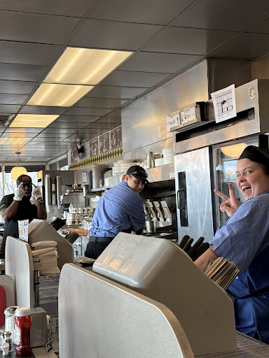 I understand there are staffing and supply chain issues but I can't not say anything about this visit. Walked in at 9 pm on a Wednesday, only 2 booths with customers, all other booths, bars empty. 3 staff that we could see, looked like a 4th in the back. Chose a booth that once we sat down we had to ask to be cleaned, sticky with syrup and plastic silverware scattered under the table, maybe our fault... should have chosen a different booth or a bar seat. Served with menu also sticky with syrup. Ordered very simple small order for myself and my husband but it took almost half an hour to get the food on the table, and both orders were wrong. While we were waiting one of the staff took his dinner break then left his dishes and debris on the bar, by the time we left it was still there. Our food was barely edible, the bacon was cold. Hamburger was VERY dry and overcooked. Omelet looked like it had been cooked in dirty grease, the eggs had a gray tint. While we were trying to eat another staff sat on the lower bar, on cell phone and shouted to the other staff about trying to get another staff member to cover a shift. Obviously not well-trained staff, or they just didn't care. Not very eager to go back to this location, and we actually live here so would normally...