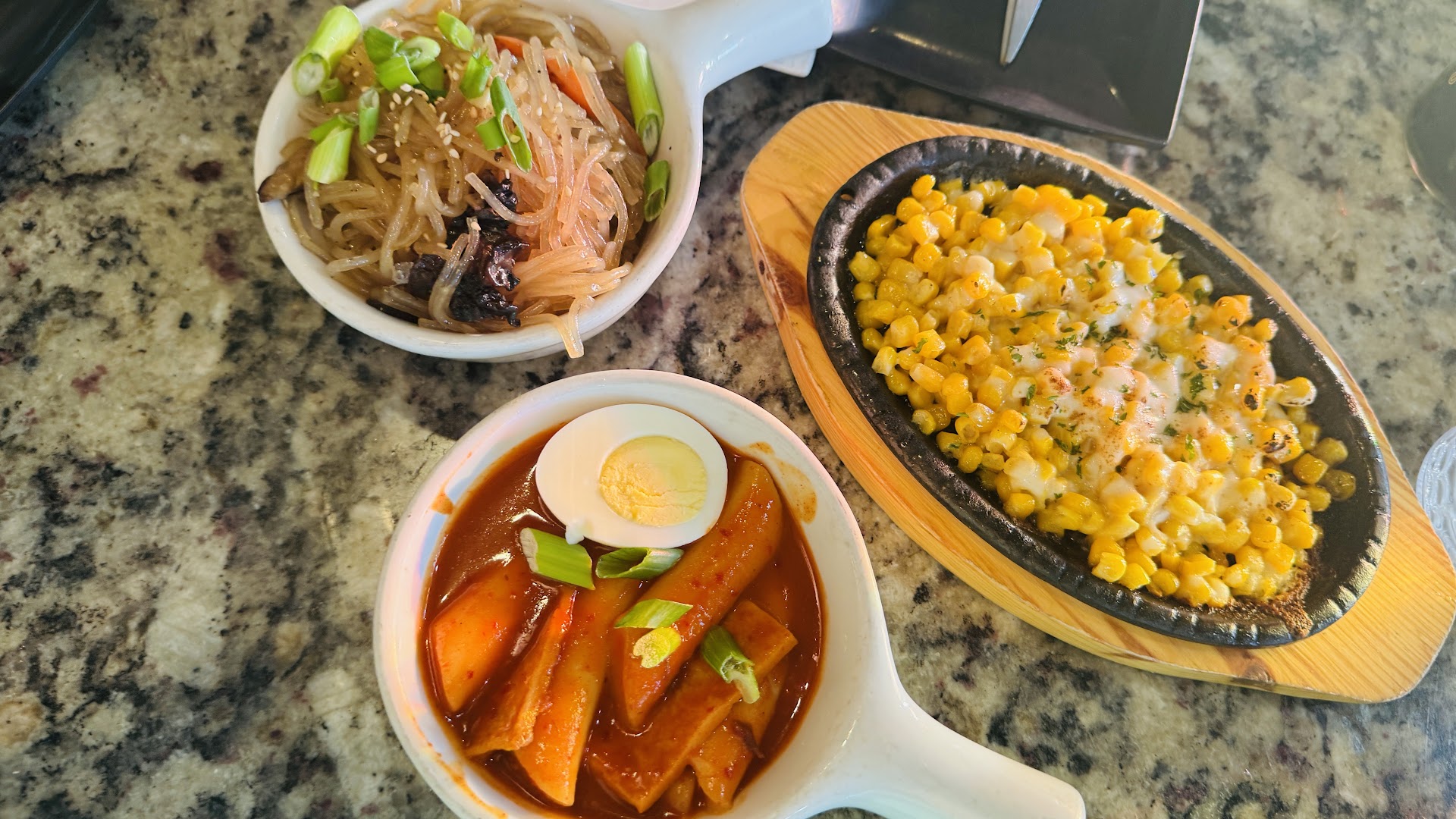 Once we ordered the premium AYCE, our waiter automatically brought out one of each side so we could try everything, which we appreciated. The corn cheese was well-executed and exactly what you would expect. The japchae and gyoza were good. I didn't enjoy the spicy rice cake personally, but my husband did.