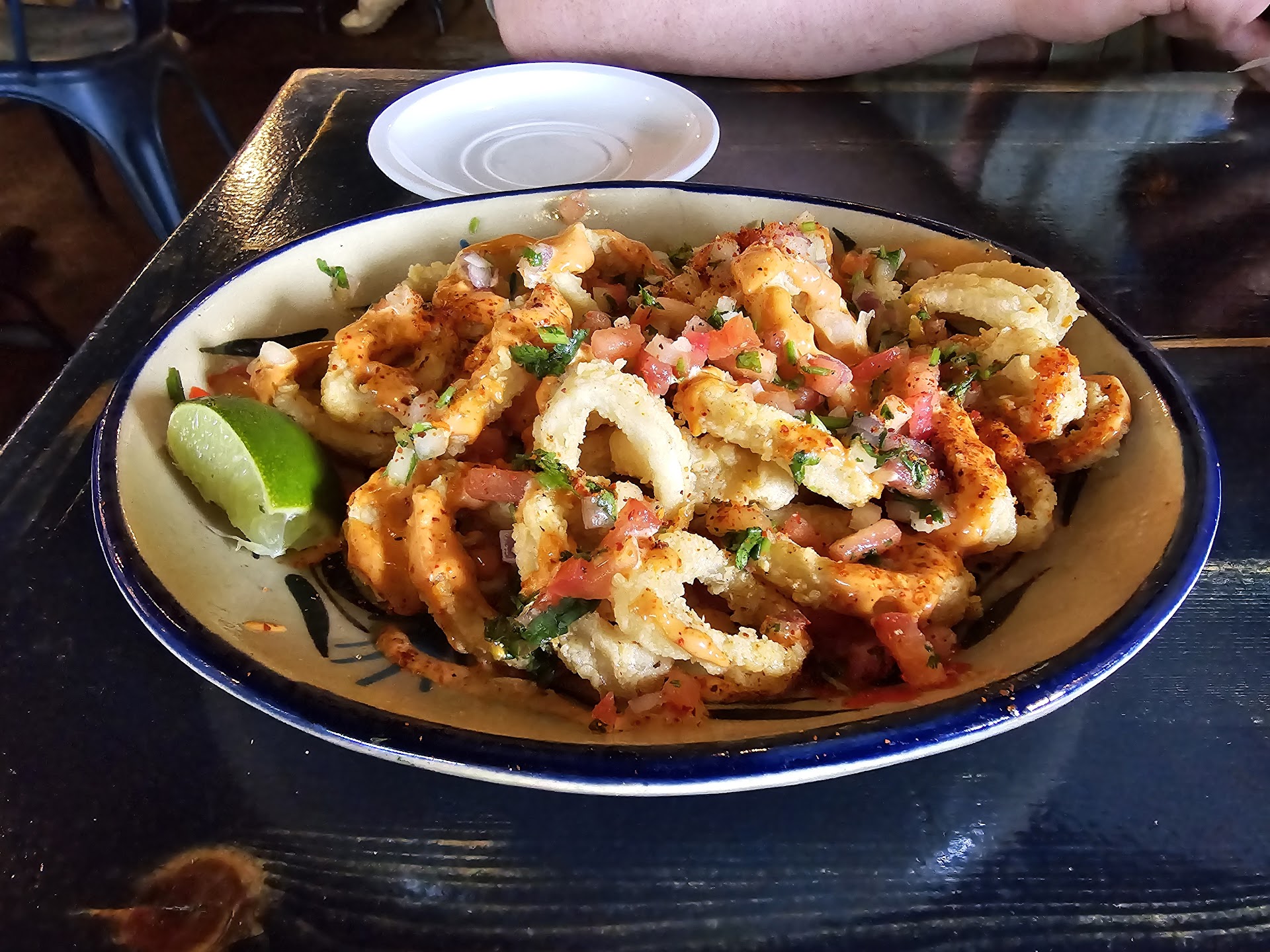 Read moreWas pretty excited to try this place out, especially in this newly developed area. It was ok. The staff was very nice but the atmosphere for me anyway wasn't good. The chairs were metal and honestly small for a girl with a bigger booty and thighs than a very skinny girl, lol. My boyfriend was even uncomfortable, lol. It was VERY loud in there. I'm glad everyone was having a good time, but it echoes, which makes it extra loud. We ordered the calamari appetizer, and for me, that was my favorite thing. Very good sauce, not too spicy, seasoned well, and crispy. My meal was just ok. Nothing special, honestly. I ordered two chalupas, but I think they thought I said tostadas, which I can understand because it was so loud, so I didn't complain at all cause I like tostadas. They were pretty soggy and not a lot of flavor, just pretty bland. My boyfriend had a grilled chicken dish with cheese, and that was pretty good. Tender chicken, seasoned good and filling for him. Idk maybe it was just a busy day, maybe I'll try them again because again the staff was very nice and that really helps a restaurant for a second chance. Pretty busy area for sure so go early and try to get a parking spot because that was...