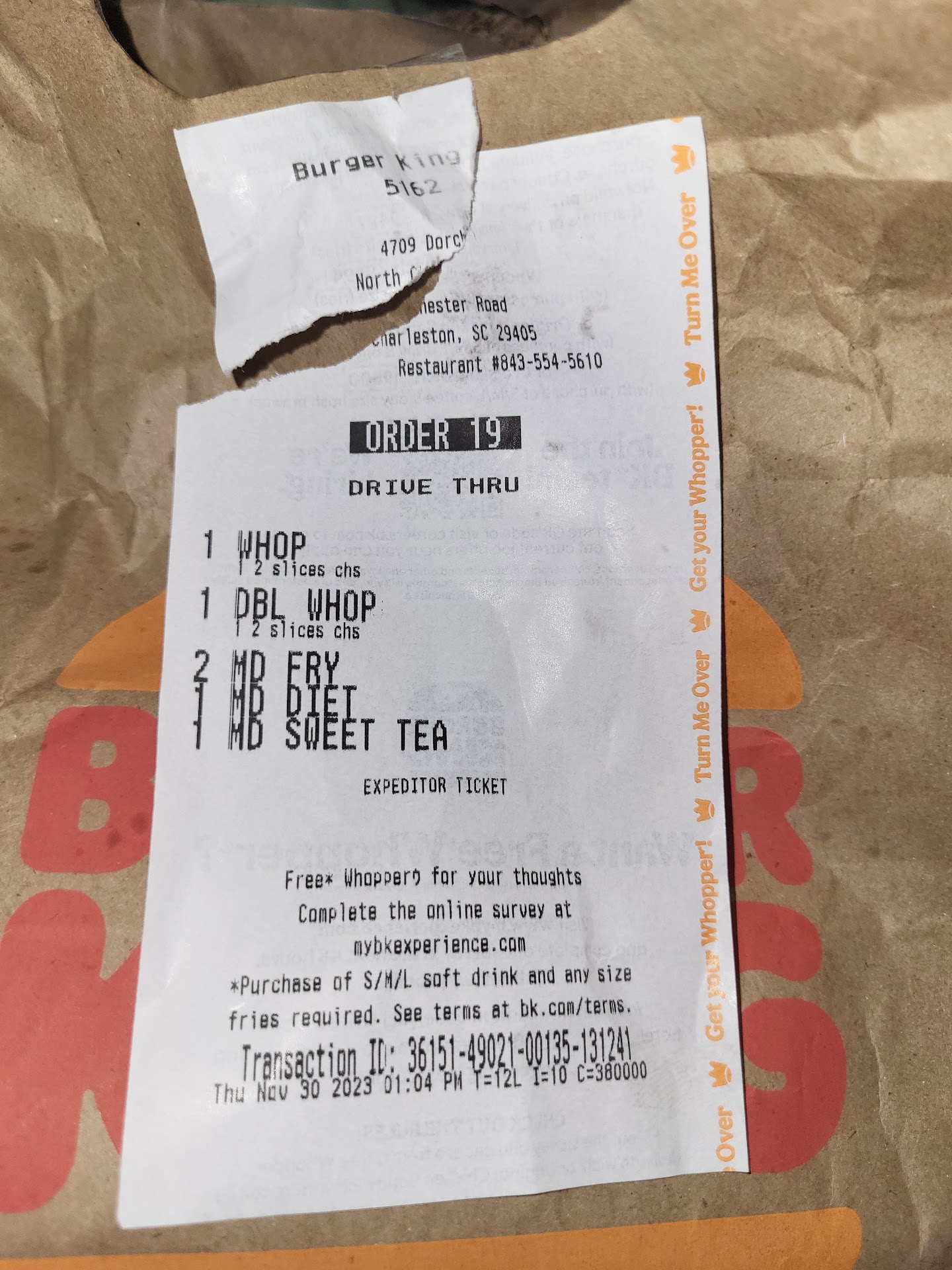 Read moreI worked at Burger King as a teenager back in the late 80s in California and minimum wage was horrible but we had work ethic and never stood around. This doesn't seem to be the case in South Carolina where you wait in the drive through for ever, employees standing around and have ear buds in their ears for music or phone calls. Customer Service non existent when I place a order tried using the BK app but informed they didn't know how to use that code and when tried to modified the order just for the Whopper informed the Manager wasn't around to void with the key so had to pay the full amount. I said then just write on the receipt your initial and cross out the fries and drinks and said no she would have to pay it and didn't have authority and had to wait for Manager who was at another Burger King picking up supplies. I wasted about 30 minutes in drive through and just drove off and place an order for Wendy's on their app and picked it up instantly with minimal wait. If this is how Burger king in South Carolina treats customers I can see why all the locations in Charleston have shut down as well as the others in Santee. So for my burger fix will be Wendy's or Chili's Tuesday $6.99 burger special for me. Used to really like the Whopper but guessing will cut that out of my diet...
