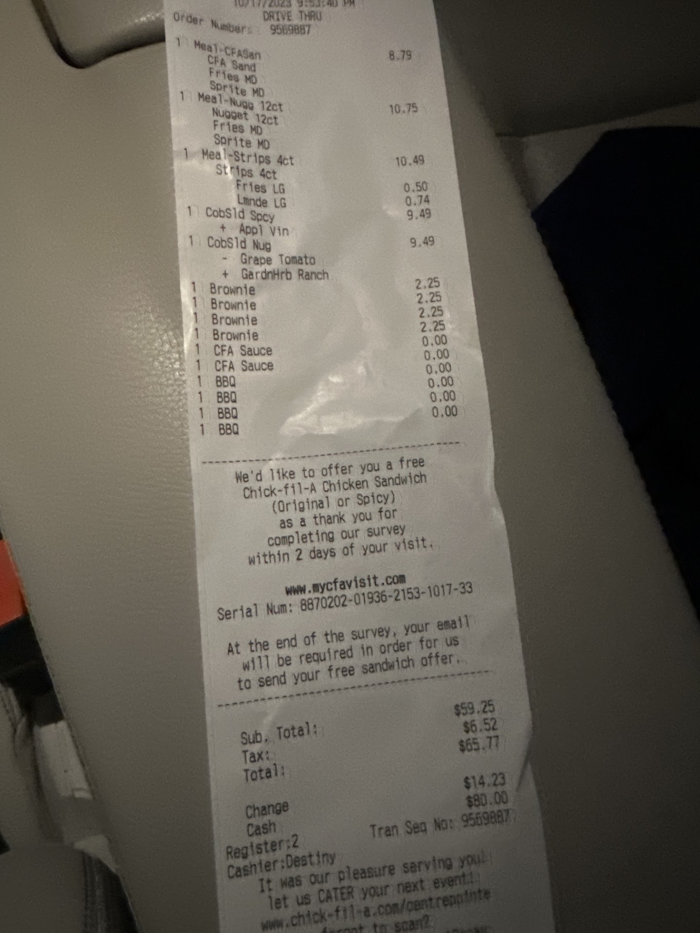 Ā Ā Ā Read moreIāll start out this review by saying that I rarely eat fast food. Most of it makes me feel bloated and disgusting, but CFA has been my go-to for a quick meal because itās always been reliable, fresh, and hot. I was in the area during my lunch break, so I decided to go to this CFA for the first time. Didnāt think twice about it for the reason I just listed. Iād never been disappointed in the past. I was in for a rude awakening. I was pressed for time because I had a work meeting. Ordered off the mobile app, no issues at all. Went through the line, got my food, looked in the bag before I drove off, but didnāt see any ketchup despite ordering fries. Now, this may have not been out of the ordinary, but Iāve never ordered ketchup when I ordered fries. Itās always been in the bag. I flag the carhop girl down and ask for ketchup. She gets some for me and I leave. By this time, my meeting is starting so I have to pull over right outside the CFA parking lot and hop on. I took the food out of the bag and then I realize that my ice cream cup that I ordered is missing š so I turn back around and have to go inside to get it. I will say that everyone at the counter asked me if I needed help while I was waiting, but the fact that I had to go inside which I wasnāt counting on irked me, so I was looking pretty annoyed. Finally, get back to my car, take off again. Pull over outside of the CFA parking lot again, hangry at this point, rejoin my meeting and start eating. I take a sip of the usually delicious lemonade and itās WATERED DOWN. Not from ice, I could tell that it was just plain watered down. Either they made it incorrectly or they changed the recipe, but at this point Iām fuming. Iām praying that this is just not the direction CFA is headed in. I have been a LOYAL customer for over 20 years. Every single fast food place has gone to hell but CFA has always stood strong. I even disagree with CFA politics but I still eat there, which is very unlike me. If I go back to CFA and this happens again, Iāll have to put this company...