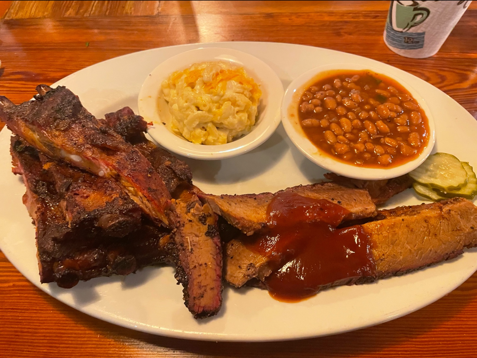 The meal had at least 6oz of brisket, 6 ribs, Baked Beans (flavored with meat and what looked like a little bits of jalapeños in them that were totally amazing), and Mac & Cheese that was equally delicious, and a glass of water for $30 plus tip.