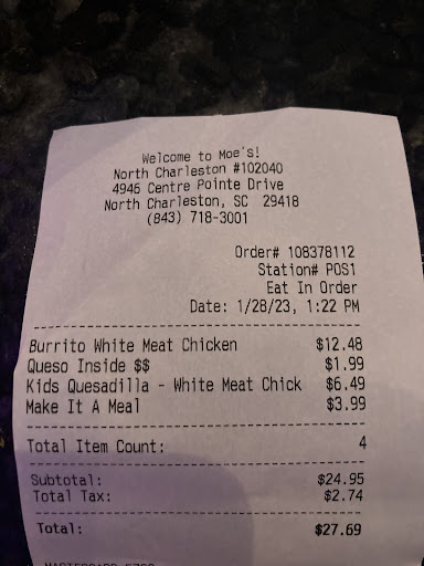 I travel to Charleston often. Last time I was here I came to Moeās for dinner at 8pm when they close at 9pm. Two ladies were bringing in signs for the night but i didnāt think they were closed yet, and neither communicated to me anything. I walked past one lady to follow the other through a door, she closed the door and locked it right as I was reaching to open it. I walked away and the other employee never said a word. So rude. Today I gave them another chance. I usually go to Chipotle across the street but wanted a change. At lunch everyone was cold and a bit rude. I couldnāt even get the entire word āguacamoleā out before the man interrupted me loudly, āthatās extra!ā The cashier said āchoose a tipā and I chose none. Then the transaction canceled so she re-did it and more loudly this time said āchoose a tip THEN insert your card.ā I again chose none and said thank you when she gave me the receipt but got no response back. It costs nothing to be polite, I donāt know why this Moeās was so rude on two different days. Food was good, restaurant...