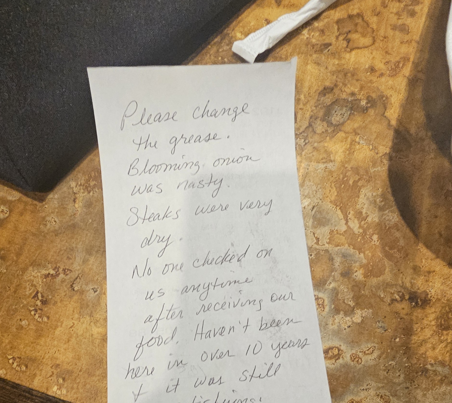 Original post* Worst experience I've had in years going out to dinner. My girlfriend and I dont get to go out much these days between juggling work and family. In fact, usually we are struggling to stay awake by the time we are home to cook dinner for ourselves. Occasionally on a Friday before heading home we can squeeze meeting up for a quick dinner and tonight chose Outback Steakhouse rivers avenue north charleston. When we walked in it was obvious there was a little bit of a wait so we checked in and sat down both starving and excited to not have to cook. After about 35 to 45 minutes our name was called and we sat at our table. Our waitress (who was very nice and polite) came over and took our drink order and due to waiting we went ahead and put an order in for an appetizer. It was easily 30 mins before we got anything to drink, no huge deal, place was crazy busy. When she brought our drinks out we ordered dinner and eagerly awaited. We got the staple loaf of bread followed by 2 more and still no appetizer. At this point an hour and some change had gone by and our main entrees finally showed up. Nothing was mentioned about the appetizer, drinks had not been refilled but alas the food was here. We began cutting into our steaks and to our delight they were both medium rare just as we ordered HOWEVER, the meat was incredibly chewy. So much so that I'd be chewing one piece for what seemed like 10 mins and for more than half of it couldn't swallow it, spitting it back out into a honey mustard sauce cup. At this point we found ourselves disappointed to say the least. I had a vegetable mix of carrots and zucchini which unfortunately were not cooked very much both extremely crunchy and cold. Now realizing I'm about to spend money I work extremely hard for and don't get to spend on going out much, I found myself beginning to feel very aggravated. My gf and I are both extremely polite people who NEVER EVER EVER EVVVVVVER complain but I felt like this was beginning to seem absurd. At no point did our waitress come by and ask how anything was, never checked to make sure if we needed more to drink or anything and again our appetizer just seemed to be forgotten about. Because of how hungry I was I ate everything I possibly could but ended up taking more than half of the steak to go. When our waitress brought the check over to me the appetizer was clearly listed on there and although I didn't want to pay for ANY OF WHAT I JUST HAD and felt everything inside of me saying "complain, you have the right to" I simply let her know we never received the appetizer and she politely said she'd take it off. I asked for a drink to go and off she went. I sat there for atleast another 20 mins just waiting for a change to my check and a drink to go and watched as a table next to me complained about issues they had with their food to their waitress. Atleast I wasn't alone???? When our waitress came back she laid the check down, said thank you and took off. No drink to go. As I stated before I never complain, I'm always leave a good tip even for not so great service because I understand bad days or rushes that cause chaos. As my check stared at me I couldn't help but think that this establishment does not deserve my money. I've rarely experienced such a lackluster and complete failure to service a paying customer. Being the nice guy that I am and not wanting to spend another minute sitting and waiting to speak to a manager who probably wouldn't care anyways I simply paid the bill, left a tip that was not deserved and wrote on the receipt "worst experience I've...
