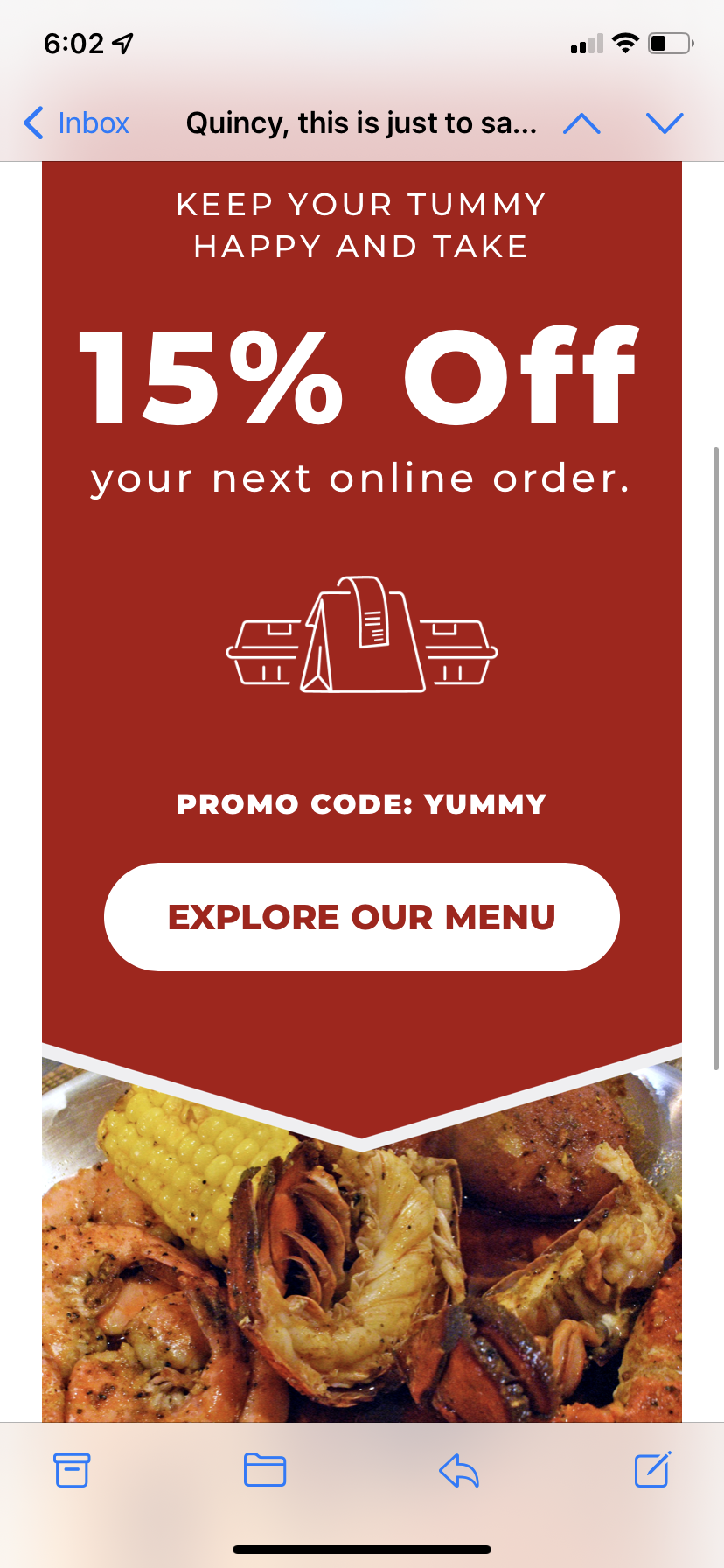We have eaten at this location several times as well as ordering online to pickup several times. We usually get the Fantasy Platter when we order online to pickup. Today, I received an email as the pictures show, offering 15% off my online order. I tried to place the order online and there was not a place online to put the code:YUMMY in in order to get the discount. I called the location and a young man answered the phone. I told him I couldnât apply the discount online and that I would like to order over the phone. He basically told me he didnât know what I was talking about and they donât have discounts. I again told him it was in an email that was sent to me from Red Crab. He puts a woman on the phone and she asks about the discount, I tell her the same thing I told the young man. She told me to come in and show her the email to get the discount. On my way there, she tells me the discount is only online. I told her yes, we talked about that on the last call and you told me to come in and show the email. She says no, they donât offer discounts and prices are higher. So, at this point Iâm mad because the chain restaurant Red Crab Juicy Seafood sent me an email that they have no clue about and will not honor. It wasnât even about the discount, it was about customer service. I will not support a business if they are not ethical. You lost a loyal customer.