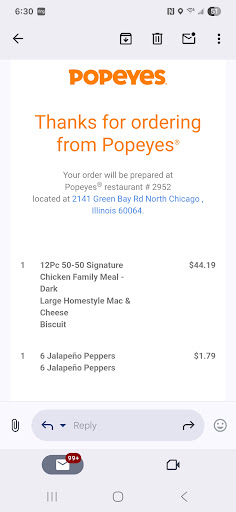 Read moreIt is very rare that I have a bad Popeyes experience, but this is the worst of the worst, and this location takes the cake! Usually, it's one or the other, but this particular location offered bad food and AWFUL service! First off, I am from the south, so we are accustomed to speaking, customer service doesn't exist here! I attempted to pay for my order with a Popeyes gift card and the cashier tells me that they don't accept gift cards, her exact words were "no, we don't take that here." After asking why with no response, I asked for the manager and asked why if it's your restaurants gift card 🙄, he replied that it could only be used online because you have to scratch the numbers off. Puzzled but not up for confrontation I asked him if that is the policy for all Popeyes and he replied yes. I informed him that I use them all the time and has never been refused only for him to switch and say " well this one" I used my card and returned to my hotel right up the street less than a mile ( the next light) away. My chicken was old and dry and the fries soggy and cold! A complete waste of money and time! Definitely not even a fair first impression!!! As I am only here for my son's Naval Graduation I won't be back but for considering patrons, I strongly advise against it! Instead of stars this location deserves...