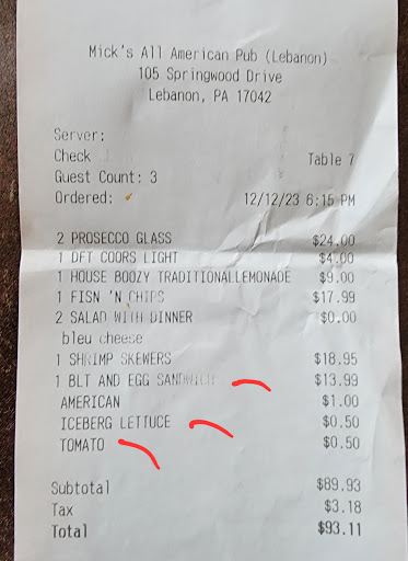 Read moreThis is far and away the worst experience at a restaurant I have ever experienced in my life...and I'm old. I ordered a burger with swiss cheese bacon and sauteed mushrooms. When it came out the mushrooms were not cooked at all (cold) and there was no bacon at all and the burger was undercooked. I complained and the wait staff said they would redo the burger, my wife chimed in and said that all I needed was sauteed mushrooms (I hadn't even noticed the missing bacon yet). I didn't want anything from the kitchen at this point because I have heard horror stories about sending food back. I waited while my wife got a box to take her food home with us. The wait staff brought out sauteed mushrooms and I scraped the old ones off and put the fresh on and tried to eat it, but I just couldn't at this point. We paid our bill and were getting ready to leave and the employee said we had another burger done, you can take it with you. I DIDN'T ASK THEM TO MAKE ME ANOTHER BURGER. I refused it and as we were walking out a guy comes out of the kitchen..(The cook maybe?) and said in passing have a nice day! and I replied sarcastically "Yea right" then he said "Don't ever come back" and my reply was "don't worry we won't" and he proceeded to follow us out. Muttering something to us. I actually felt physically threatened at this point and kept walking. Wow. He even stood outside staring at us as we pulled away.