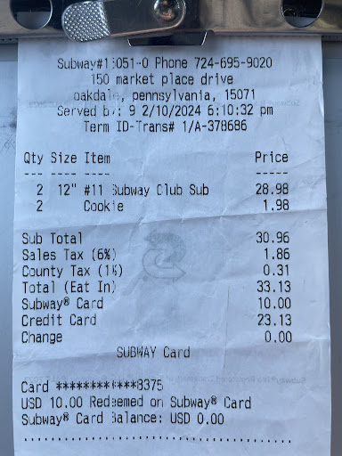 I came to this store expecting to use a coupon - two 12” subs for $12.99. I immediately noticed a sign that read “we do not accept coupons at this location”. I was disappointed but ordered anyway because I was already there and I was hungry. Two 12” subs and two cookies later - $33.13! I did NOT order the full meal with drinks. In the moment I didn’t say anything because there were customers waiting behind me, but after stewing on this for a couple days, I suspect fraud. How does that math compute when the 12” subs are listed on the menu board for under $10? I tried to call the store for an explanation but of course no one answered the phone and the voice mailbox is full. Again, to me this is beyond poor customer service. This is sleazy corporatism with bait and switch tactics, and...