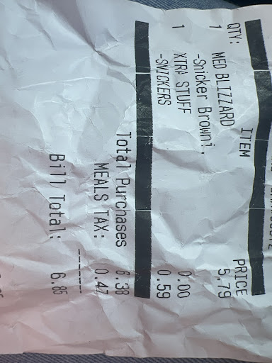 Read moreThe manager (a male) on 9/16 at 335pm shut the window in my face because they made a mistake with my order. I paid extra for snickers in my blizzard and there was barely any snickers in it. He stated âI am not going to be your emotional punching bagâ as I tried to EXPLAIN there is always an issue with my order when I go there. Last time, they put peanuts in my husbands blizzard and heâs ALLERGIC to peanuts. We made it all the way home by the time we noticed so we let it go and THANK GOD we had Benadryl to administer for his reaction. The BLATANT DISRESPECT today is UNBELIEVABLE. The customer service is poor. And today was my last day there! Donât even bother here. Go to Ashleyâs on...