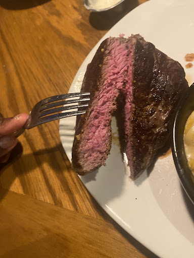 We both ordered our steaks medium rare which is a warm red center. My daughter's sirloin, when she cut into it was underdone and completely gristle. I ordered a ribeye which was so salty my eyes watered and my mouth burned. We sent those back. About 15 minutes later, we got new steaks and my daughters was blue (as in completely raw and dark on the inside). Mine was very very rare, although the manager tried to convince us both that they were medium, but finally conceded that they were underdone but took them back and cooked them a little longer. Honestly when they came back, mine was medium well and my daughters medium, but at that point, my husband was done eating and we just wanted to go home so we didn't send them back again. The manager dropped them off, said he would check back, and didn't until we were leaving.