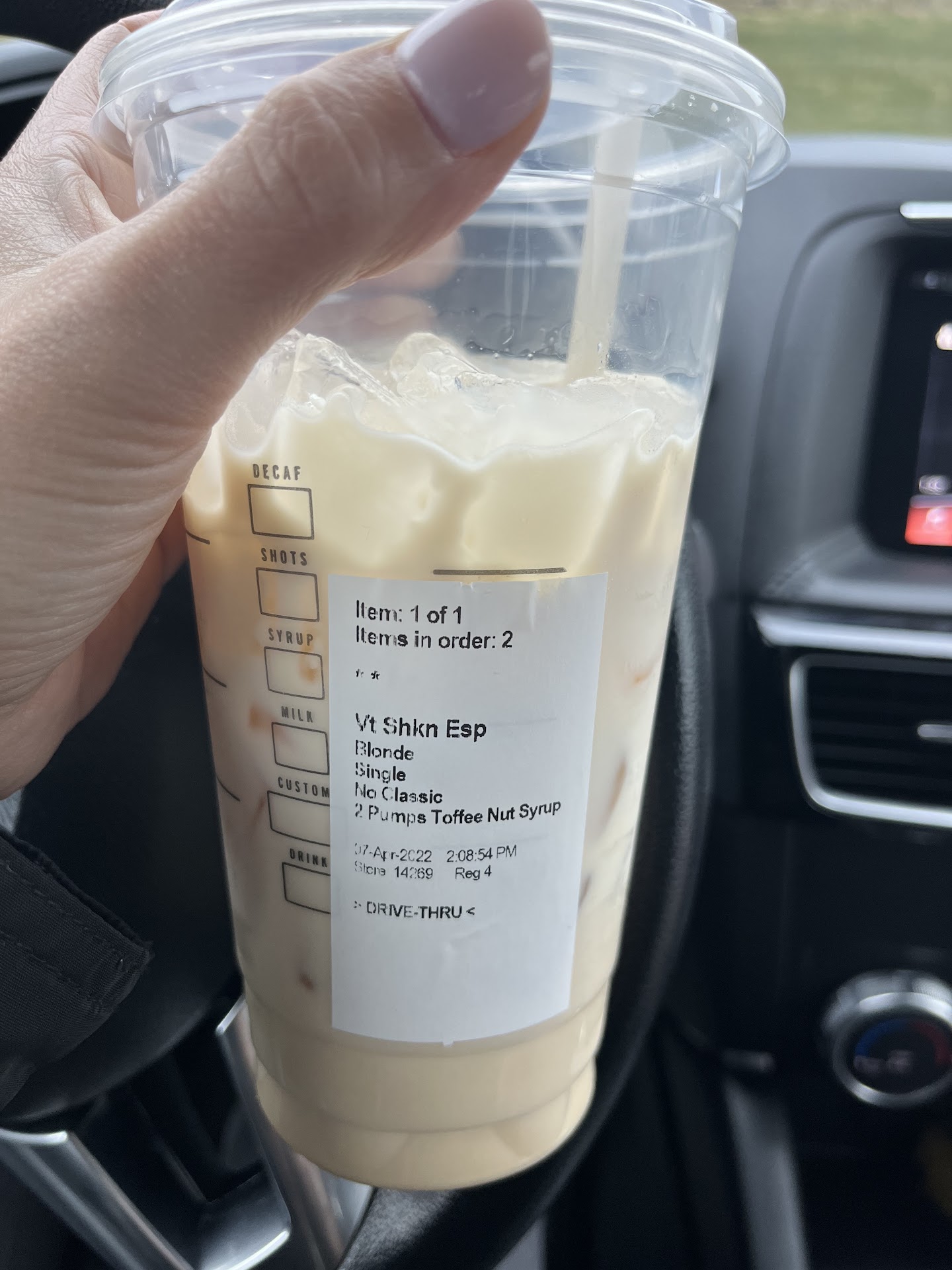 Ā Ā Ā Read moreThe barista taking my order inside must have been new. I ordered a venti dirty chai latte with almond milk and two blonde shots with cinnamon powder. When I received it, the sticker said venti chai latte dry with cinnamon powder. However, when I brought it back up they remade it with the espresso no problem. My friend ordered a white hot chocolate with coconut milk and peppermint, and received a white hot chocolate with almond milk. It wasn't excessively busy, so I wish she would have asked if she wasn't sure how to enter something. The inside was a bit small, so I wouldn't go here for studying...
