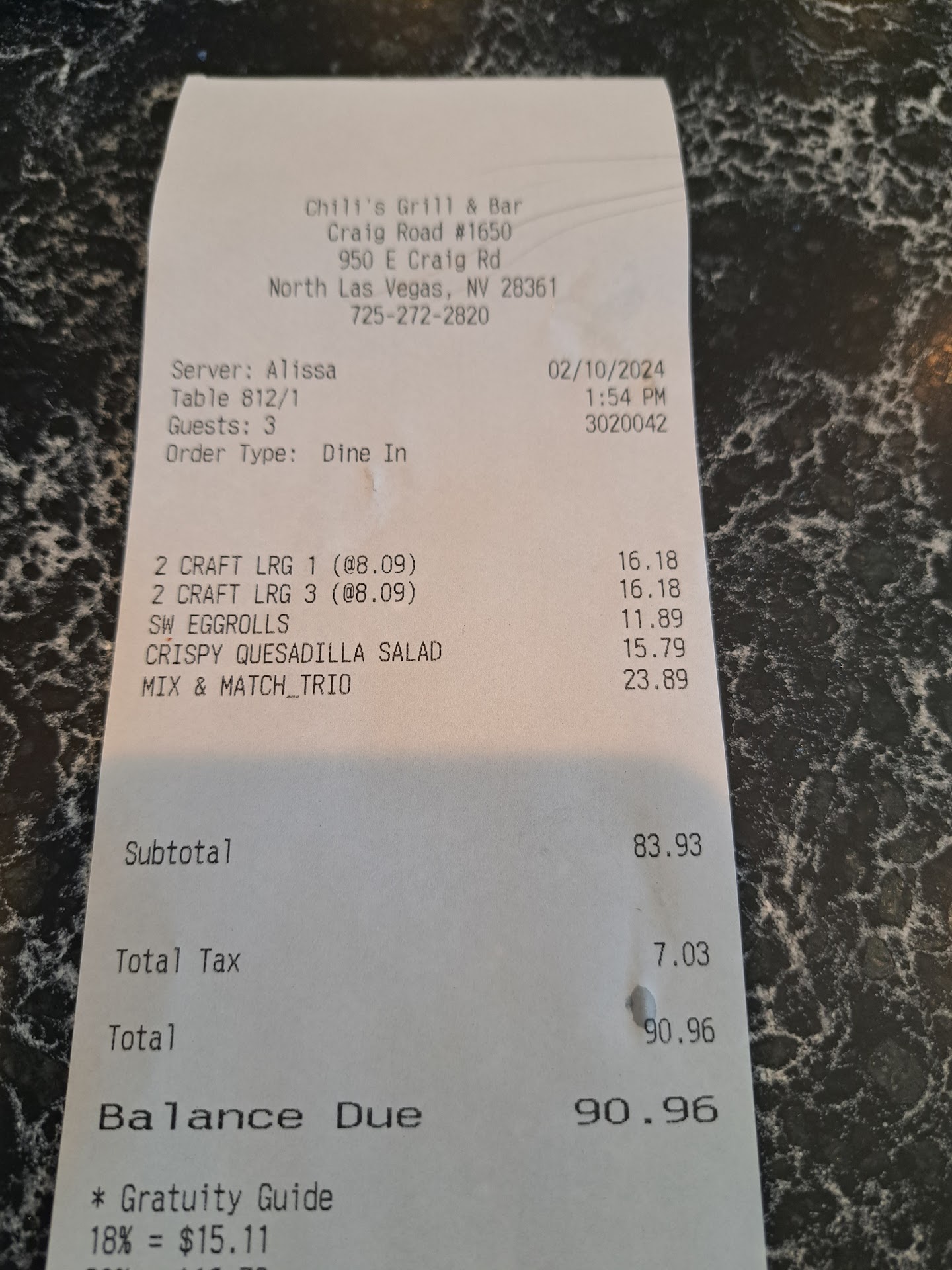 Ā Ā Ā Read moreMy family and I went to this location after not visiting Chiliās In a long time. We were so excited to try the 3 for me deal we live far from this location and we made the trip to go even if it seemed far away. Honestly we had such a bad experience from start to finish !!! We got sat down at a table by the hostess and no one came to greet us at all we waited around 10-15 mns no waiter or anyone came to out table to offer at least a drink . I saw 2 families get seated and a waiter took their drink order right away . I had to ask for the manager and explain the situation . The manager brought us drinks and chips and salsa and sent a waiter our way. He waiter was nice I believe his name was Eric. He did tell my 8 year old he could order fries it was included in the kids meal but no come to find out they charged us $1 for it . Our food arrived and fries were so salty I ddnt want to complain anymore so just left them there . Manager brought another round of chips . My husband also got the 10.99 deal 3 for me which was charged incorrectly in our bill the deal is supposed to include a fountain drink and I have no idea why they charged us for 2 root beers on the side( my husband asked for root beer which was supposed to be included in his 3 for me deal) that itself was 7$ just for 2 root bears they charged for his chilli bowl and burger at a regular price when we asked Eric he āfixed it for usā but forgot about the 7$ root beers whatever we paid for it supposedly they said they had fixed it. They put on the bill my husband had got water and charged for his drinks on the side We donāt like to complain at all and I donāt do reviews but honestly I wanted to know how I feel it was such a disappointment I will never go back to this Chiliās so people if you order the 3 for me make sure they are charging you right I felt like I got scammed!!!!!!!! Smh I donāt mind paying but why lie to us again I will never go back to this...