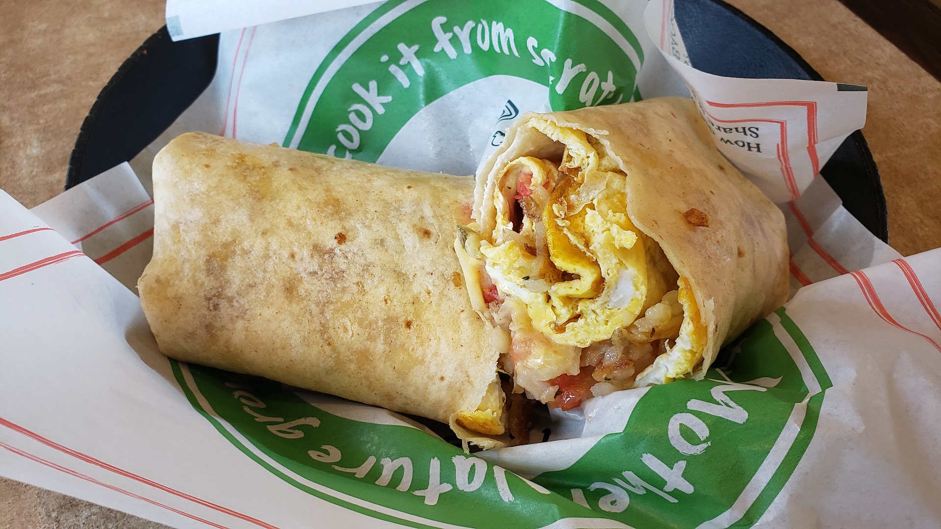 After thinking about that experience, I decided to eat something that was cooked, and went for the breakfast burrito. They wouldn't allow me to trade the red meat choices for either turkey or chicken without charging me extra. So I just ordered it without meat.