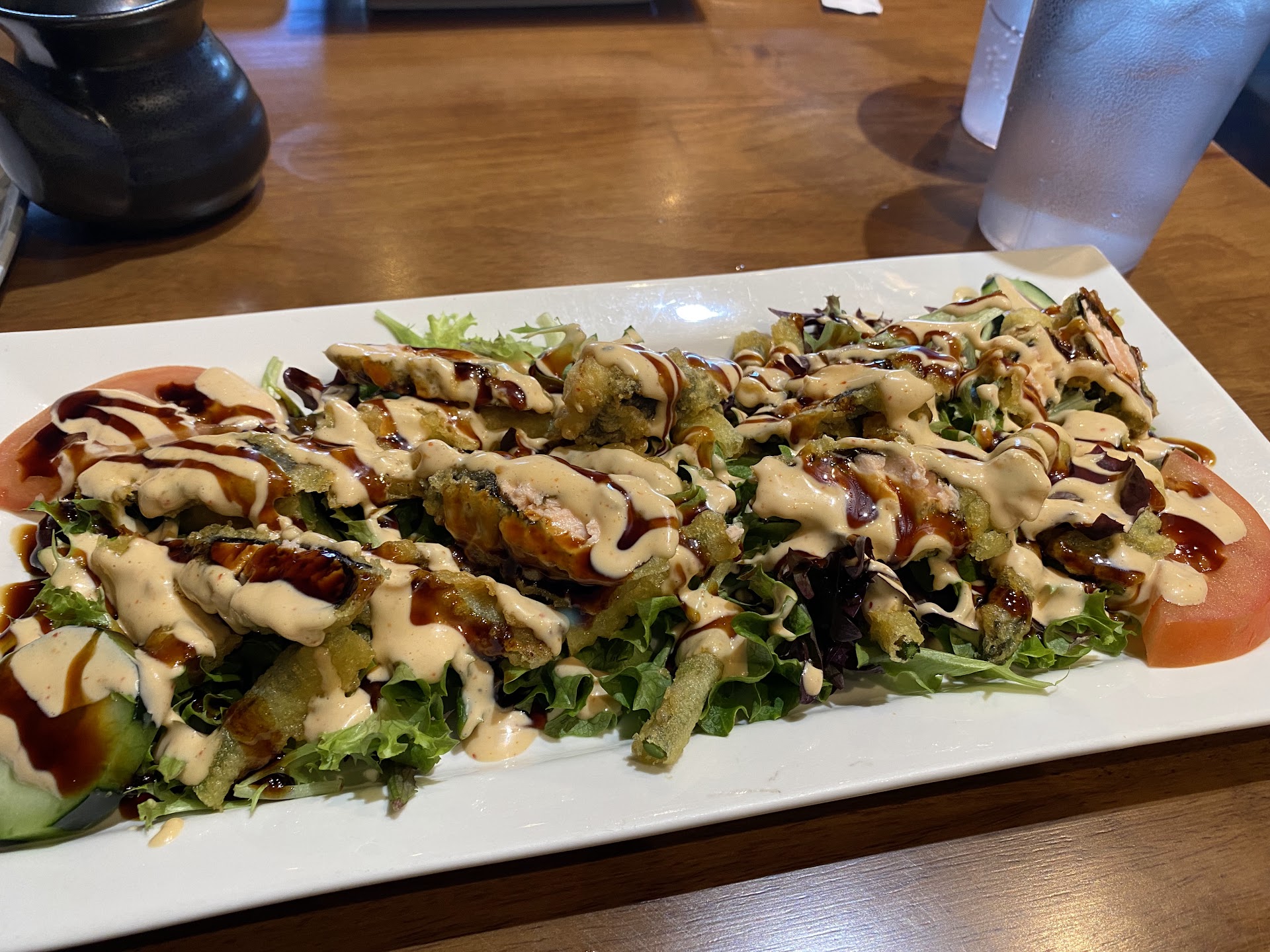Ok, we finally get to order. We order lunch specials, salmon asparagus salad (10 out of 10, so good!!!!), hibachi shrimp and chicken and it comes with fried rice, a small plain salad, soup (also tasty) and 2 different types of sushi rolls. I remember she ordered spicy but I don’t remember what kind.