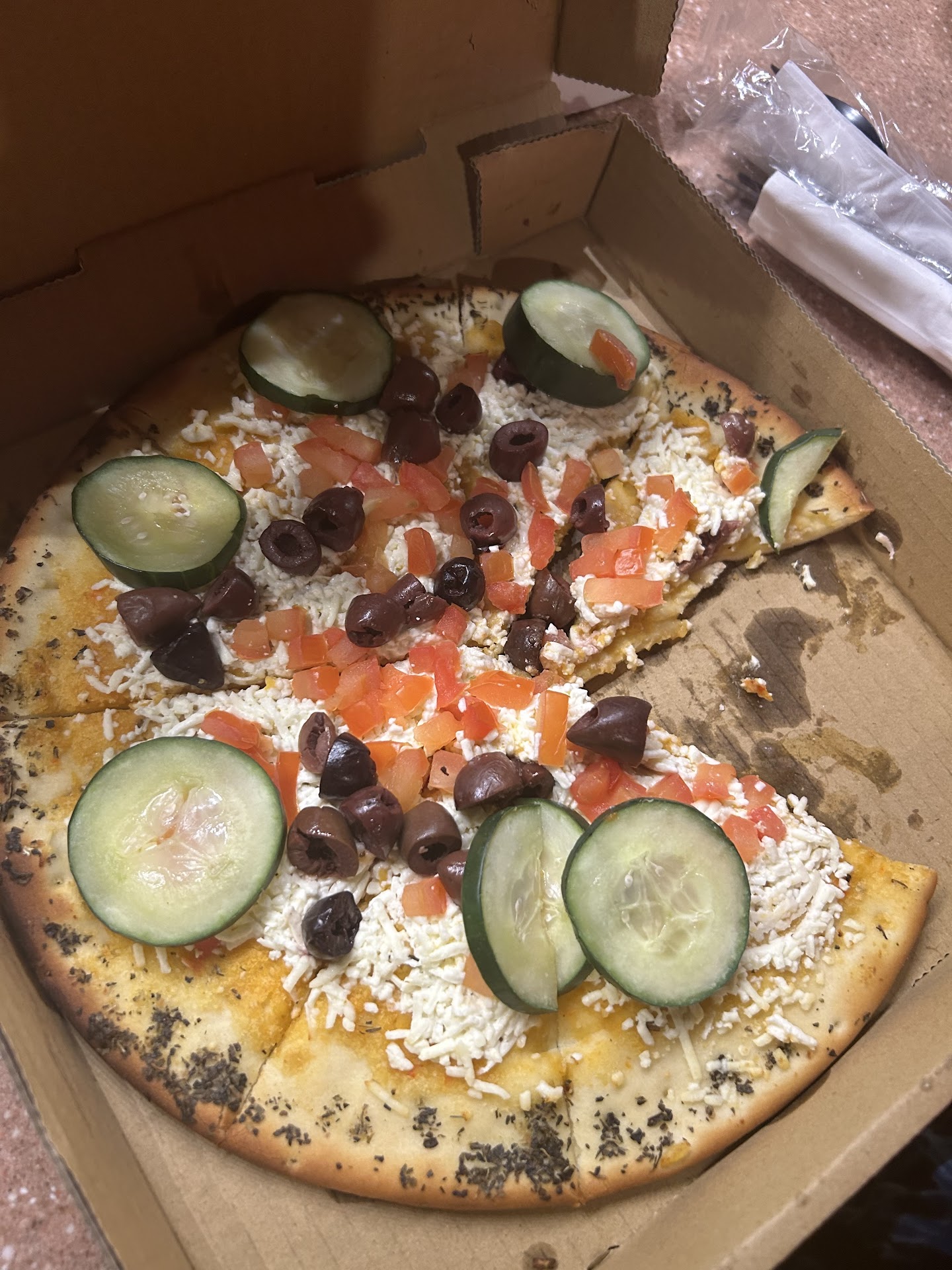 The size of the pizza was generous, making it a perfect option for sharing with friends or for a satisfying meal on its own. I couldn't help but notice how well-balanced the flavors were, with the tanginess of the olives and feta perfectly complementing the sweetness of the tomatoes.