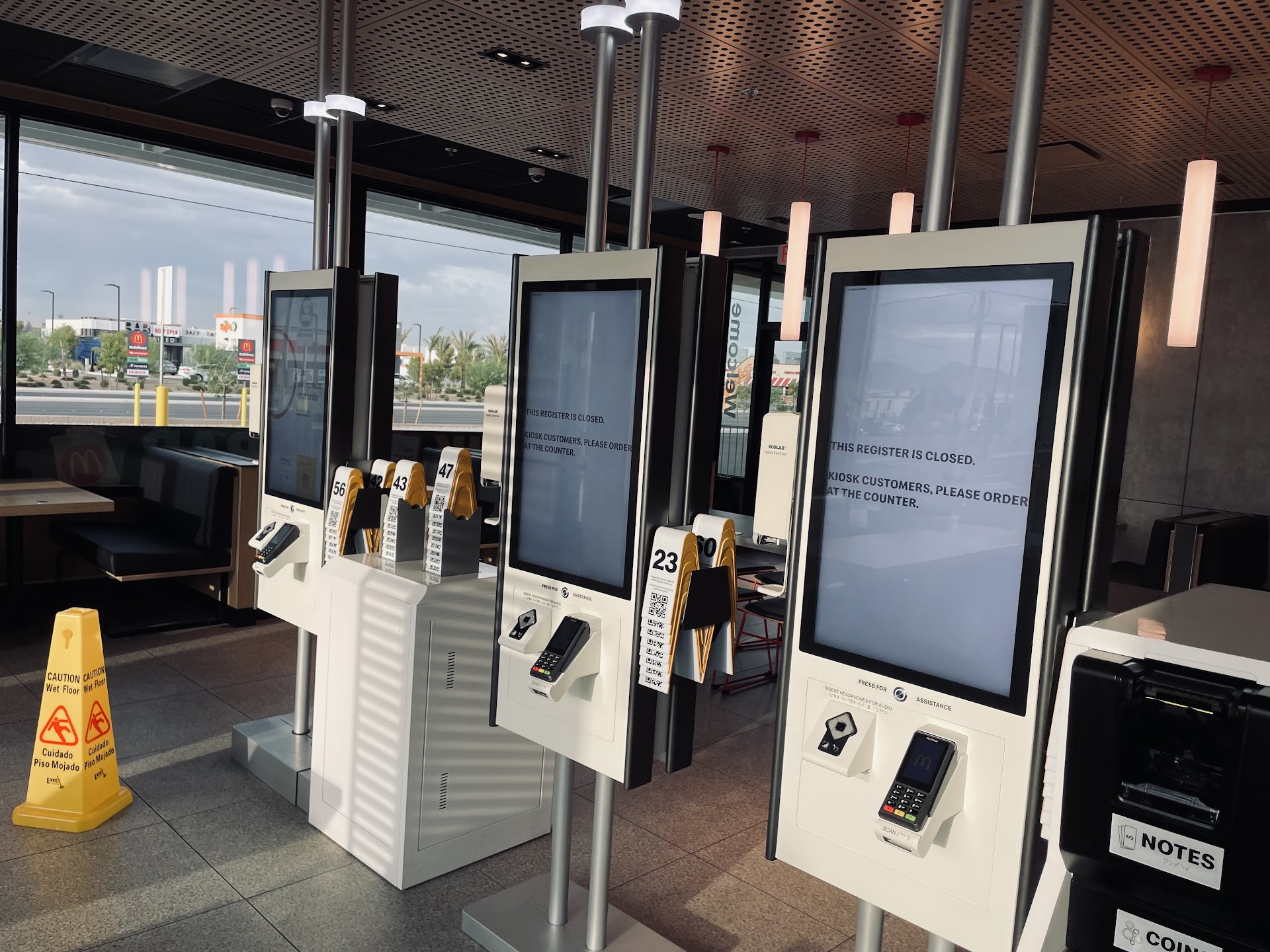 Nice restaurant...I highly recommend not eating there. Went there with my husband and was hoping to have a great time. We were given the food pretty fast. My husband's straw fell on the ground and the manager expected him to use it insisting it was fine. Tried to eat the food. We ordered 2 cheeseburger combos for both of us. My first burger had so much pepper you couldn't eat it. When he went up and spoke to the manager he was told that all mcdonalds use pepper. Never was offered a sorry do you want me to remake it? The second one I tried also had huge amounts of pepper but it was also very burnt and dry. My husband had me try one of his and it too was very burnt and dry. The burger reminded me of the super fake meat I would get on a burger in school as a kid but much worse. When I asked for extra Ketchup I was given 3 small packets. Honestly there is not enough Ketchup in this world to make those burgers edible. The food tasted very old like it was probably cooked that morning or the day before. I ended up eating a couple fries because that was all that was edible. We have never been to a McDonald's and had such bad food. I highly recommend not eating here. *update * went back to give it one more shot everyone has a bad day. Went in and ordered on the screen. Wanted a happy meal. The screen doesn't let you choose a toy for anyone older than a toddler, and all kids drinks were out of stock except their unsweetened tea unless you upgrade to a bigger drink and when you do that you can't pick what you want. Every table was very dirty and my husband went to get a rag to wipe one down with. He stood up front for 30 min and no one ever came up from the back. When they did it was because our food was finally ready. Asked for a rag and was never given one. We had to choose which table was less dirty. Went to throw our garbage away and had to leave it on the top of the garage can because it was so full. Luckily the food wasn't as bad but now we really will never go back. Saw a pregnant lady who clearly had to pee. She had to stand up front for 15 min before they ever...