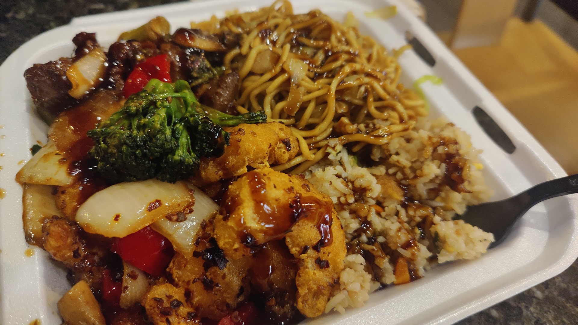 We got the bigger plate ($11.30) but paid $1.50 extra for each of the premium entrees we got. The small premium entree really isn't worth it since the to go is so tiny; only get it as part of a bowl/plate. We got a small honey walnut shrimp ($6.70) and there were only a few pieces. This was actually the most disappointing one of 4 entrees as well. The honey sesame chicken breast isn't premium but it was really good; the string beans were okay though. We got the black pepper angus steak (premium) which was surprisingly tender and delicious. The chili crisp shrimp were crispy and better than the honey walnut shrimp. We got half chow mein and fried rice which we mixed with the teriyaki sauce. The fried rice was a bit too mushy...