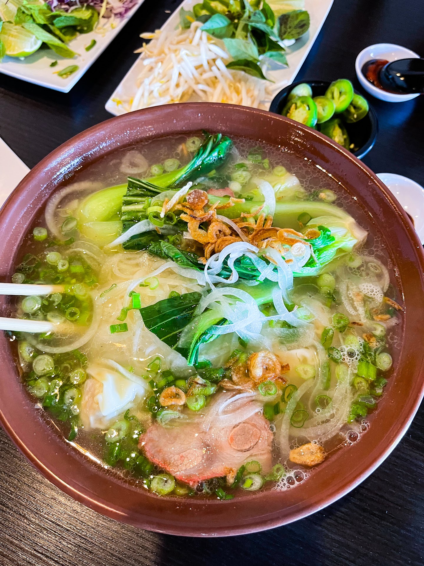 The location is spacious and the food is really quite good. The fried chicken wings are spectacular; the pho flavor and portion are great. They really are generous with their noodle and meat portioning. The spring rolls are just mediocre….and I wish they had this sausage patty rolls (nem nuong cuon?) like Pho Saigon, but it is what it is. I’ve tried the wonton soup with rice noodles (pictured) and it’s also rich and delicious.