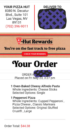 Read moreI have always loved pizza huts bread sticks. I am 33 and have enjoyed them since i was a kid. I ordered at this location a few months ago and everything was exactly what i expected same old pizza same old bread sticks with sauce in a BOX! Lets face it when we order from pizza hut we all know what to expect. I just ordered fom here tonight and the pizza is totally diferent then i've ever had very little to no sauce and my breadsticks came cold in a bag? with out sauce? When i called back saying "can you call your guy back he hasn't left the gate yet and forgot my sauce " they said i had to order it extra and told me thats the way they have always come. I will only order from the one on durango from now on. I would have gladly paid the price had i know it was additional. Super disapointed since the only reason i ordered pizza hut was cause i was craving the bread sticks w/sauce . I should have lessened to my husband! He was right...