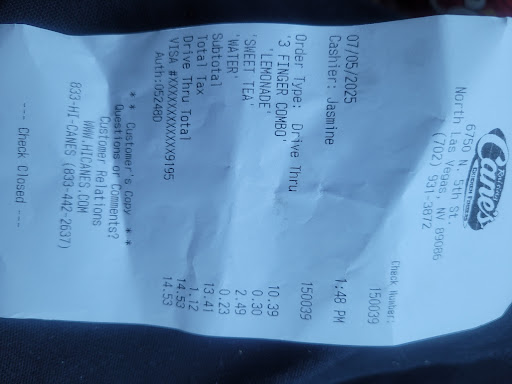 Read moreAlways check your receipt when you buy at this location. I went to the drive-thru and just ordered a Caniac Box with an extra side of ice for the drinks. The cashier said that my total was $21+. So I proceeded to the window and she repeated the same total amount of $21+ when she opened the window. So I gave her my credit card and paid. I was waiting for her to give me the receipt to see why it's $21+, but she just handed me my food. I asked for the receipt and she said they ran out of paper so she can't print it. I asked her how much the Caniac combo was, and she said it's $17.29. I asked her how much the tax is, she said it's $1.45. So I asked her why she's charging me $21+. She said it's just $18.74 and she needs her Manager to print out the receipt. She called the Manager and gave me the receipt after typing stuff on the register and printing it, stating that the cashier added a bottled water in my order and that he corrected it. My gut tells me that she added some unauthorized tips which made the total go up to $21+. So always do your math especially if you have a big order. Imagine if they do it to every drive thru customer, it adds up! That's an additional $2+ for my order. I mean it's only $2, but it's the principle behind it. Integrity...