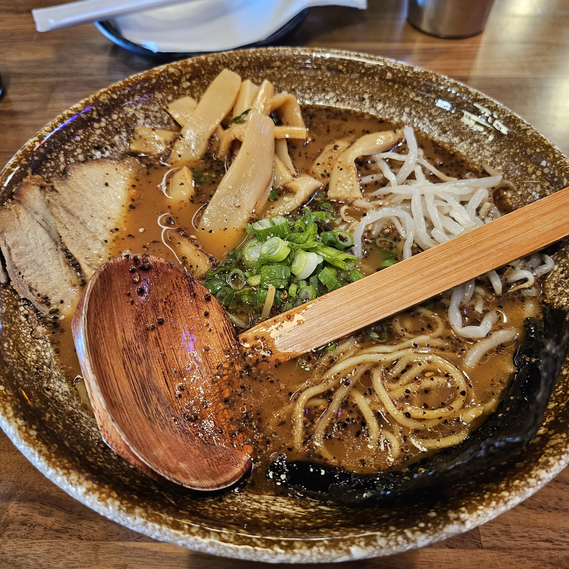 For my main, I went with the Tonkotsu Black. I’m usually a fan of Tokyo-style ramen with that rich, creamy tonkotsu broth, but this place’s broth was different. It wasn’t creamy like I expected, but it was still amazing. What really set it apart was the addition of roasted garlic pieces on top of the usual garlic black paste. The roasted garlic packs a punch—one sip and you really feel it! The presentation was beautiful, too, which made the experience feel extra special.