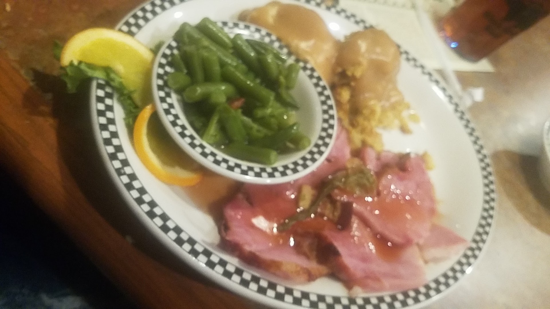 Now I've been to the Black Bear a few times and most of the time I get what I pay for, and maybe a little extra. This time, they clawed back all of that and then some. Remember above I said I ordered a ham steak? Well, I'm thinking something like you would get at Cracker Barrel or at least the Waffle House, but no...I got a ham wedge, with a good portion of it being fat -- see the photo below! Would you pay $13 for that? My eggs were cold and over easy and the pancakes were starting to harden from being under the lights. At the time of delivery, my friend asked for a glass of milk and 5 minutes later was presented with a glass 1/2 full of milk, adding to the stinginess the cooks showed with the gravy on his order -- it was almost non-existent. My partner's omelet was decent, but they forgot her side; and my daughters waffle tasted like something you would get at a Super8 along the highway.