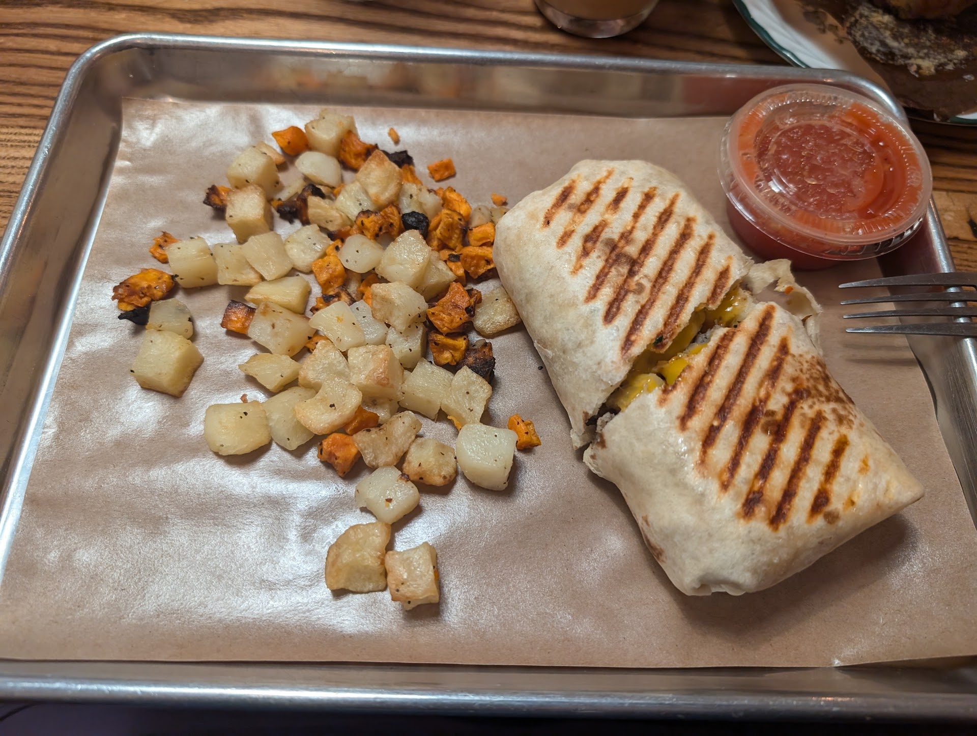 In my opinion, there are certain restaurants that cater to different people. This restaurant caters to the more neutral palate. First the good, the atmosphere is incredible. Beautiful, inviting, and quite spacious. Comfortable chairs. The service was friendly and prompt. The Mixed Berry Lemon Iced Muffin was delicious, and the vanilla iced latte had just enough coffee flavor to sweet ratio. As someone who doesn't normally drink coffee, this hit the spot. On to the mediocre. First of all, they ran out of biscuits at around 12pm, while I'm not gonna hold that against them, if you are gonna be a brunch spot, biscuits should be a top priority in my opinion. I ordered the breakfast burrito that is served with potatoes/home fries. My first bite was mostly tasteless, I couldn't really taste anything but the cheese and the tortilla. The potatoes on the side weren't cooked all the way, or had been sitting out for awhile, they were lifeless and flavorless. My partner ordered the Turkey, Gouda, and Apple Sandwich. Once again, the flavor was mild to say the least, we forgot about the apples until one slice fell out. The bread was soft and the turkey had a nice sweetness to it, but the "chutney" was watery and sparse. My partner said the salad on the side was the most flavorful thing she had had. Also, the plating was done with little care or thought, in my opinion. For a place this beautiful, the food should look exciting as well. Would definitely come back for coffee and a pastry, but maybe...