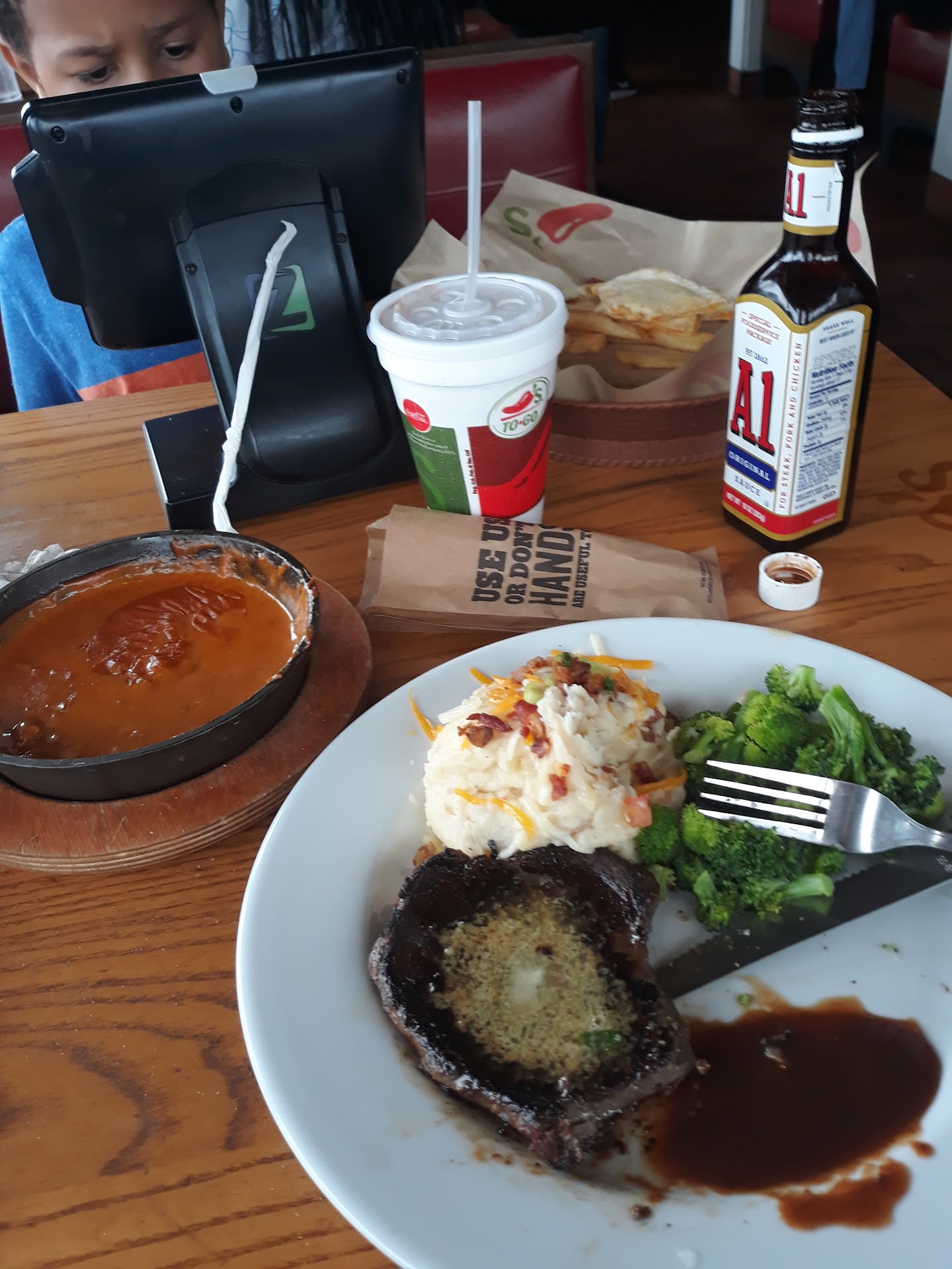 Read moreThe food was as good as any Chili's. Our waitress lacked a bit of skill in waitressing. She wasn't very helpful. We immediately made her aware that we were there for the message we received for the free kids meals. It took her a couple of trips to our table to clarify that they were out of children's menus. She tried to tell us what was on the kids menu, when she could have directed us to the kiosk or the online menu. Our meals were a ltitle slow in coming out. Then the waitress was again unhelpful when we had trouble with our ticket and the credit for the kid's meals. We don't go to Chili's very often so the staff shouldn't assume the customer is "trained" and knowledgeable about their menu or their technology. It takes the enjoyment out of taking the family out to eat.Thankfully the manager was able to clear things up and take almost half the balance of our ticket off as should have been done by the waitress. People go into restaurants because of ads, promotions and coupons. I believe that the workers should be trained so that the customer doesn't have to be. The...