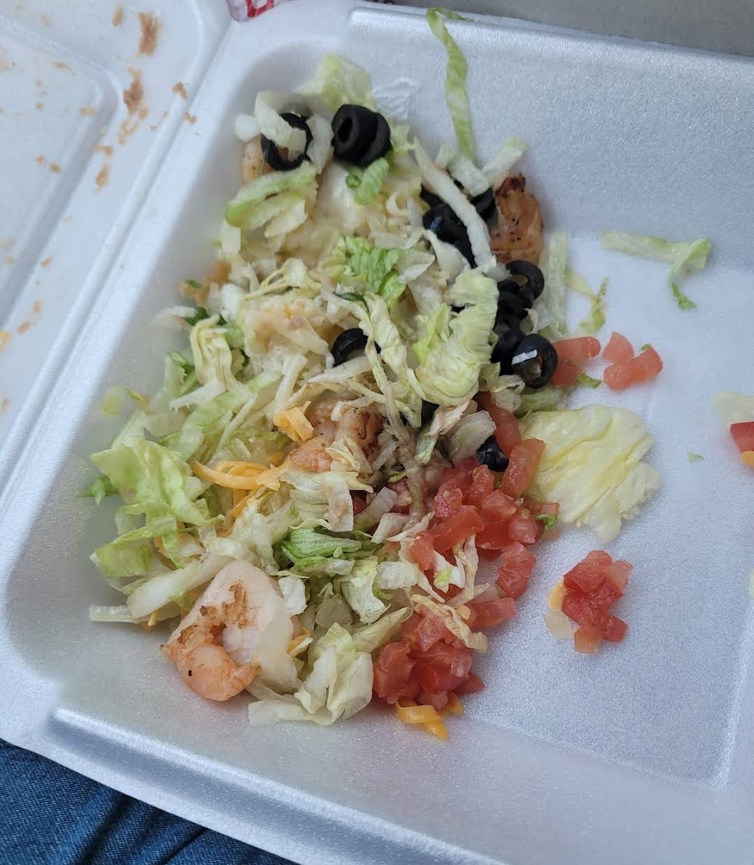 Read moreI ordered a shrimp salad to go, I asked for no refried beans and extra sour cream because I can't eat refried beans..... my "salad" was a Tortilla bowl thing, which it didn't mention on the menu, that I also can't eat (keto) and the bowl was mostly filled with refried beans with basically no salad, and no sour cream with what can best be described as bland, obviously frozen (by the weird texture) shrimp that still has the poop cord in them.... the only reason I give it 1 star (even though there's no option for 0 stars) is because my kids said the chips and salsa was ok, not to spicy, even though there was a large chunk of raw onion at the bottom.