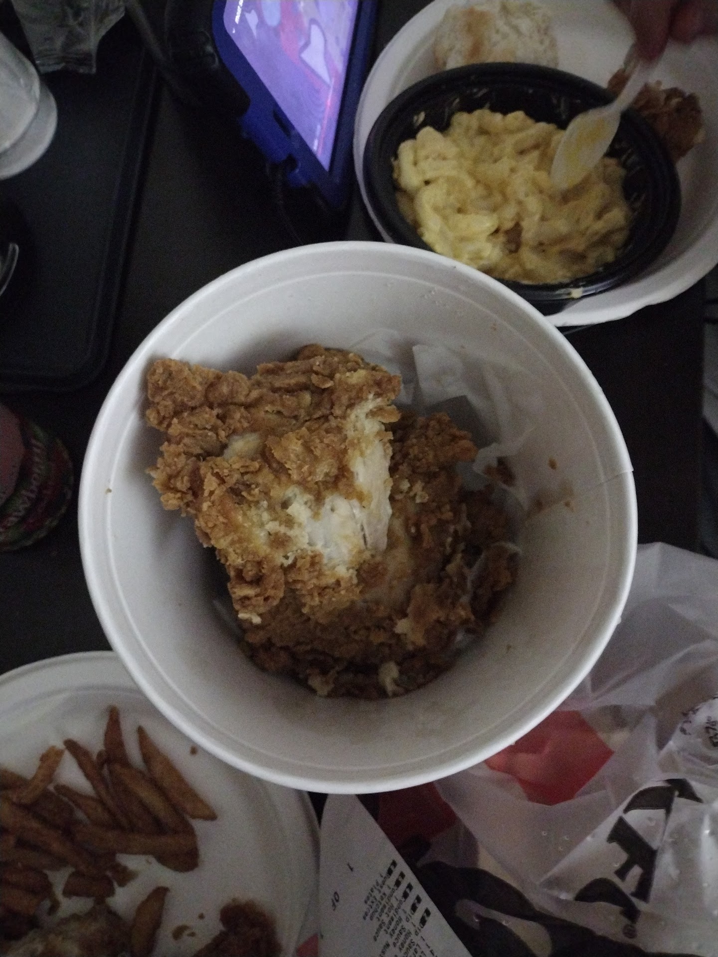 The food was terrible, I ordered an 8 piece extra crispy bone in chicken bucket meal, family-sized season fries, mac and cheese, and 4 biscuits.