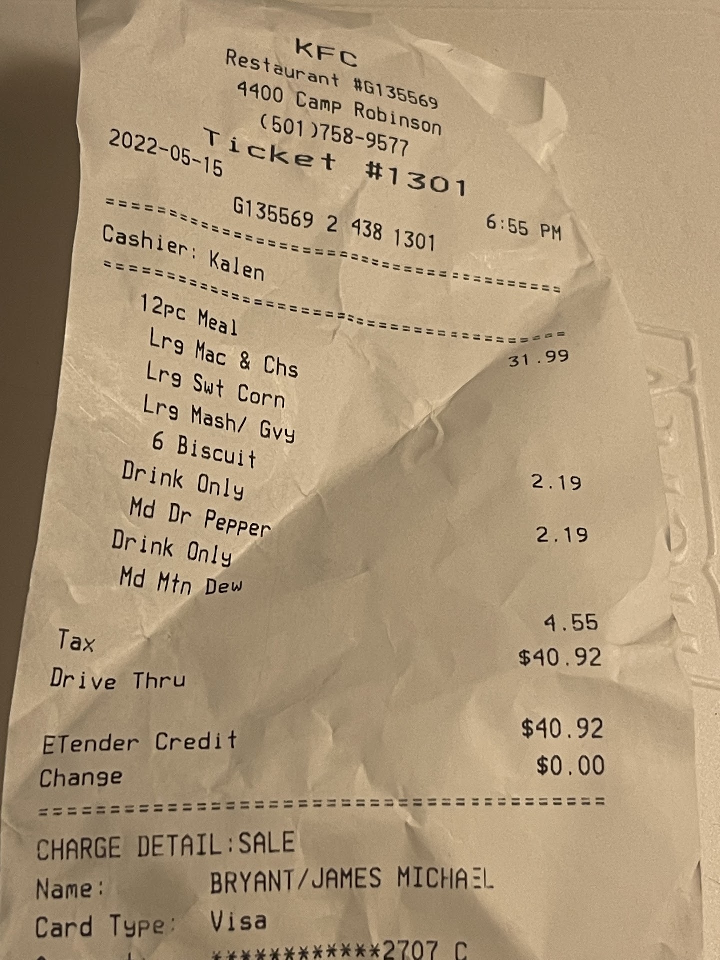 We arrived in Little Rock at 7:30 pm, checked into our hotel, and placed my order on the KFC app at 8:03 pm.