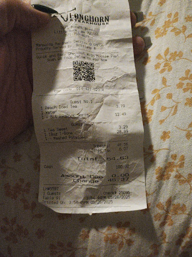 Read moreThe food at Longhorns is always exceptional. However on this particular trip me and my out of State guest was met with a few surprises. The first encounter was the Server Alexander who tossed the drink coasters to us as if we were in a Frisbee Tournament completely unprofessional. We made a collective decision to continue to dine in because of the possible wait time anywhere else on a Sunday would be hideous for a party of six. He didn't give us eating utensils until well after our drink orders had been placed.