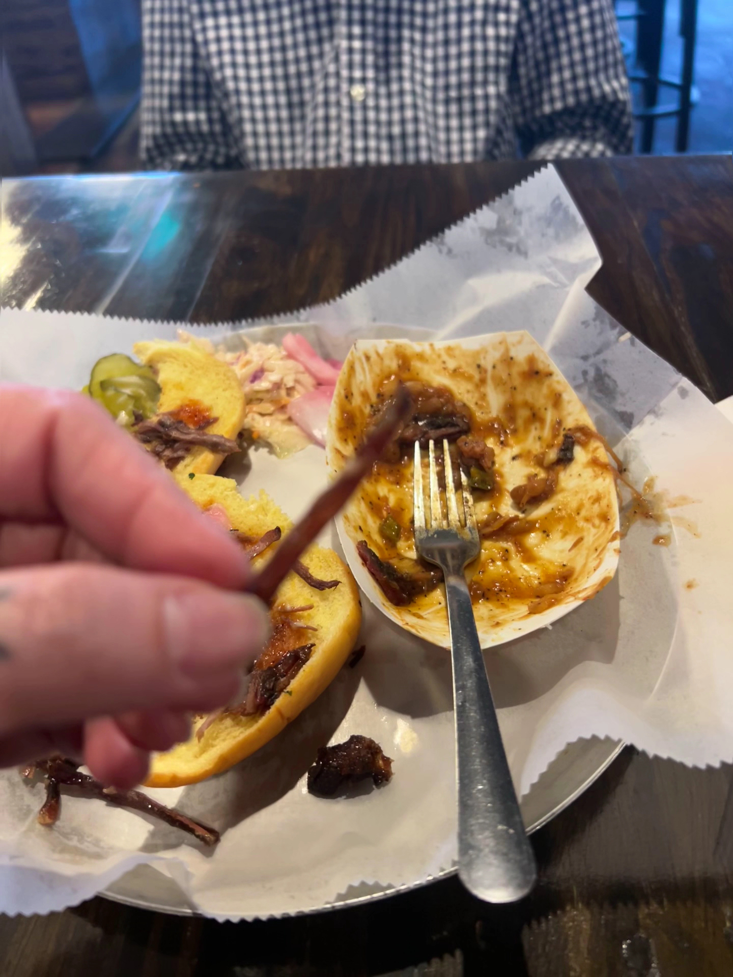 Ā Ā Ā Read moreNEVER AGAIN!! I was so excited to try this place. I had been looking forward to it for months. Disappointed isnāt even the word. This was one of the worst meals I have ever had! We never got an option to even see our receipt or a ticket. My husband ordered a pulled pork sandwich. There were pieces in it that were so old and had been reheated so much that they were basically plastic. He literally choked on it. I ordered the āhot messā with brisket (which they charged me an extra $2 for!!) I have never seen brisket like this before. It was pulled/shredded? And very old. The mashed potatoes were tasteless and terrible, they had been microwaved so long that there was a hard thick crust all the way around the bowl. When I dug into it to show my husband, there was a long hair baked into it. I am a server so I am understanding of situations but we were the only guests there at the time. That was a waste of $60! When I asked for the ticket, the server brought a machine, pushed some buttons and told us the price. She didnāt ever even let us see it so we could check it with what we ordered. She was very sweet but not attentive and seemed very distracted. I am honestly angry that they served us food that was so clearly old. My husband is super sick now. Heās had a stomachache since we got home. We basically just $60 for food poisoning. Donāt waste...