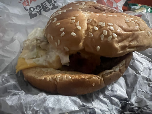We get our food and drive away, I start unwrapping my Philly burger, my wife has a few loose fries and starts her banana shake, we get 3 maybe 4 blocks away about to springhill wine and spirits (I always take note of that place because I like their grape sign) and my wife starts unwrapping her spicy chicken sandwich the first thing she asks is when did they start putting tomato on this sandwich, then she gets it all the way unwrapped to take off the tomato and there’s a whole bite taken off the bottom of here sandwich. I flipped a u-turn just past the grape sign and head back to rally’s.