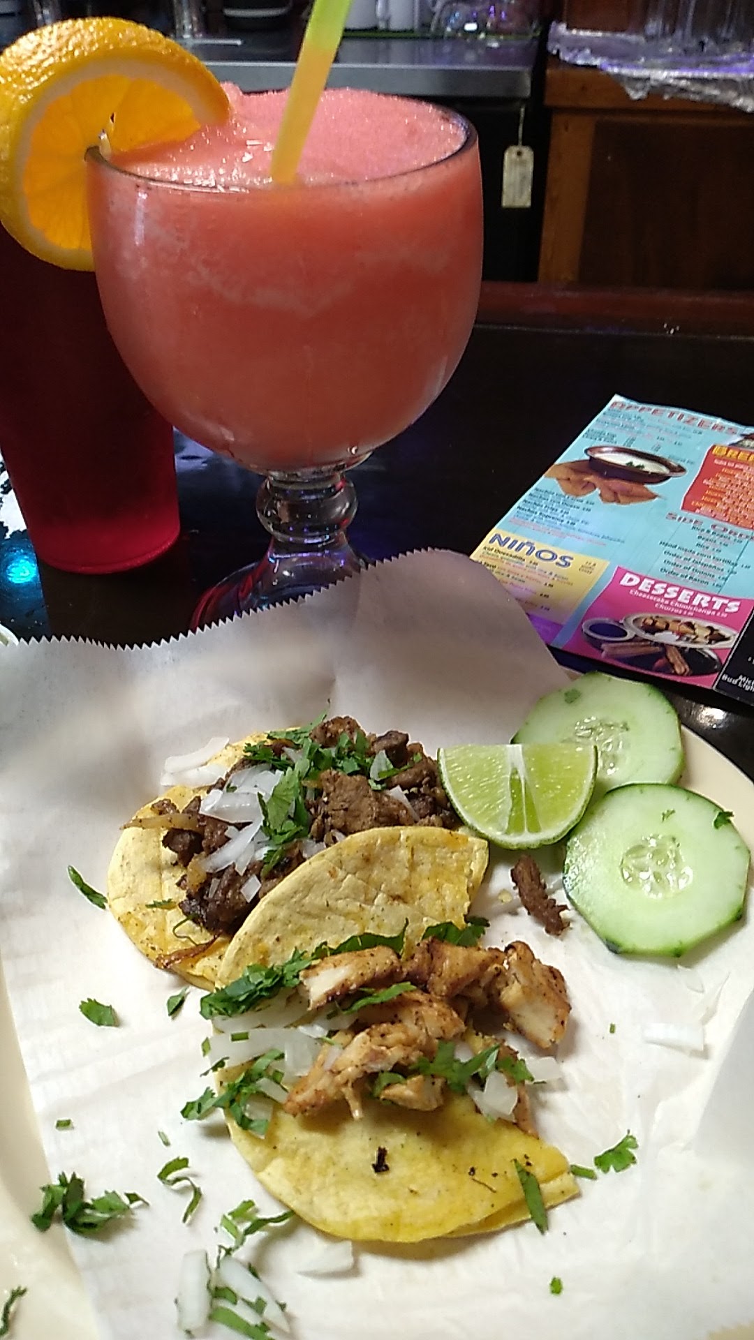 On our visit today it took 45 minutes from the time we sat to get six tacos. Granted it was 15 minutes before anyone came to see us and we were at the bar. The server’s shirt was filthy. That was the first thing I noticed. He kept asking what we wanted to drink. I told him I needed a menu. No one had brought us one. I wanted to see the drink options.