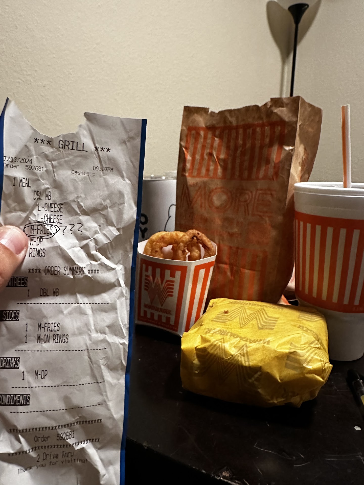 After traveling 6 hours in a car with another 10 hours to go until my family reaches our destination, we stopped at this Whataburger for lunch. What a mistake that was. We placed our lunch order at 11:10am and by 11:30 we still hadn't received our order. My stepfather then went up with our receipt to ask how much longer or if there was any issues. There were 4 employees standing around and placing their own orders for food and making customers use the kiosk instead. Finally a woman who works there asked what he wanted and after explaining how long we have been waiting, she snatched the receipt from him and told him they would START making the order and he needed to go sit back down. So he came back to table and waited another 15 minutes. In that time 2 other people, who came long after us, actually got their food. My mother went up to the counter then to just ask for a refund because we have been waiting 45 minutes no with no food. The same woman gave so much attitude and said they would START working on it. Again. There was a lot of back and forth with that employee trying to blame everyone else & asking for the receipt, which she already took. A woman who was normally not working this store & just there to train employees stepped in and apologized for our wait. It took a little while but they finally refunded our order since they STILL hadn't started making our order yet. During the time my mother waited though there another family who waited 30 minutes before finally getting their order as we were leaving and another woman came in saying she was told from the drive-thru to park and hers would be brought out to her and that was 20 minutes ago. I understand that we all came during some sort of shift change so there would be some confusion as to what had been finished or not, but it is still unacceptable to yell at customers, take and lose their receipts, and keep telling customers their order would be started after 45 minutes. We already got a refund so I don't want anything out of this horrible experience except for some more training for...