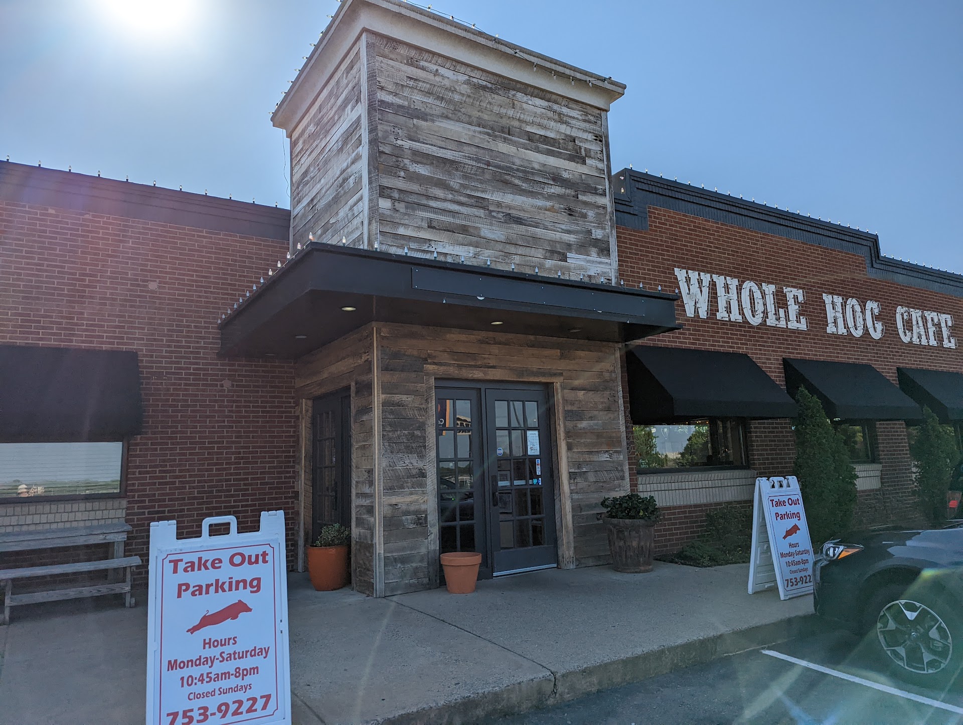 We had the pleasure to eat at the Whole Hog Cafe for the first time (actually on their last day open back in April when they closed for covid.) We’d been in Maine for four years, and no, Virginia, there is no BBQ in Maine. Or as we found anywhere else outside of Texas (we don’t know what that KC/Memphis stuff is because it certainly isn’t BBQ as we know it). So finding the Whole Hog, and being in dire BBQ deprivation, we sampled several of Whole Hog’s specialties and were completely delighted (okay, blown completely away) with how fantastic this barbeque was! The brisket was meltingly tender and deliciously moist, with a perfect smoke ring (you brisket fans know how important that ring is, and how hard to do right). That chicken must have had angel wings before it hit the grill, because it was heavenly. The sausage is utterly addictive. And the ribs were so tender the meat just fell off the bones if you just looked at it. This BBQ should be served with a warning label, because once you’ve tasted this, nothing else will ever compare. They didn’t forget sides, either. The delicious homemade red potato salad was a bowl of “Stand back, I’m going in!” The baked beans tasted like they’d baked food low and slow for hours in a cast iron dutch oven, and put even my grandmother’s baked beans to shame. (We need to try the other sides). They have many wonderful BBQ sauces. We loved #1 and 2, but you should try them all! We were in heaven with the utter yummola-ness of everything we ate!