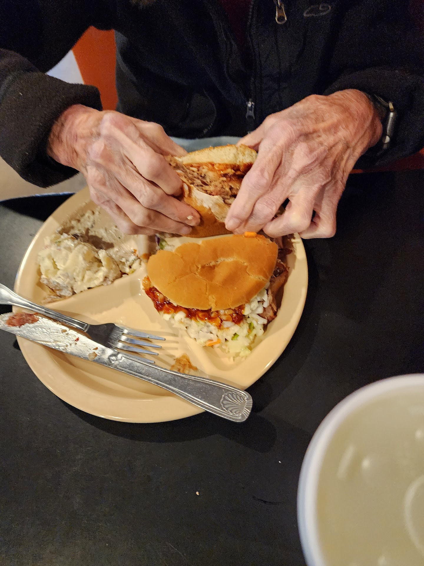 Accidentally met the owner who was unloading his van. We told him how great the food was and that we had not been able to get good barbeque since we left South Texas. But Whole Hog is soooo much better than anything we ever found, even in Texas. Rich told us this was their last day as they were shutting down for covid. We told him that when he finally reopened, we’d be there with bells on. And we did! We were so excited when we heard and saw they were finally reopening. So, as promised, we hung kitty cat tinkle bells around our necks and high-tailed it to the Whole Hog. Rich took a photo to prove it! Anyway, If you want great, really Great melt off the bone good-eatin, do not go ANYWHERE but to the Whole Hog Cafe. You will leave well-fed and happy!