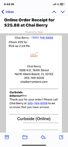 I recently visited Chai Berry for takeout and had a deeply concerning experience regarding food safety that must be addressed. Upon receiving my order, the orange juice was missing, so I returned to the counter to request it. While waiting, I witnessed the server retrieve the orange juice from a pitcher in the fridge that was visibly full of mold, with a dark ring of mold inside and the lid also covered. The pitcher was almost empty, and as the server shook it to pour the remaining juice, more mold was disturbed and released into the juice.