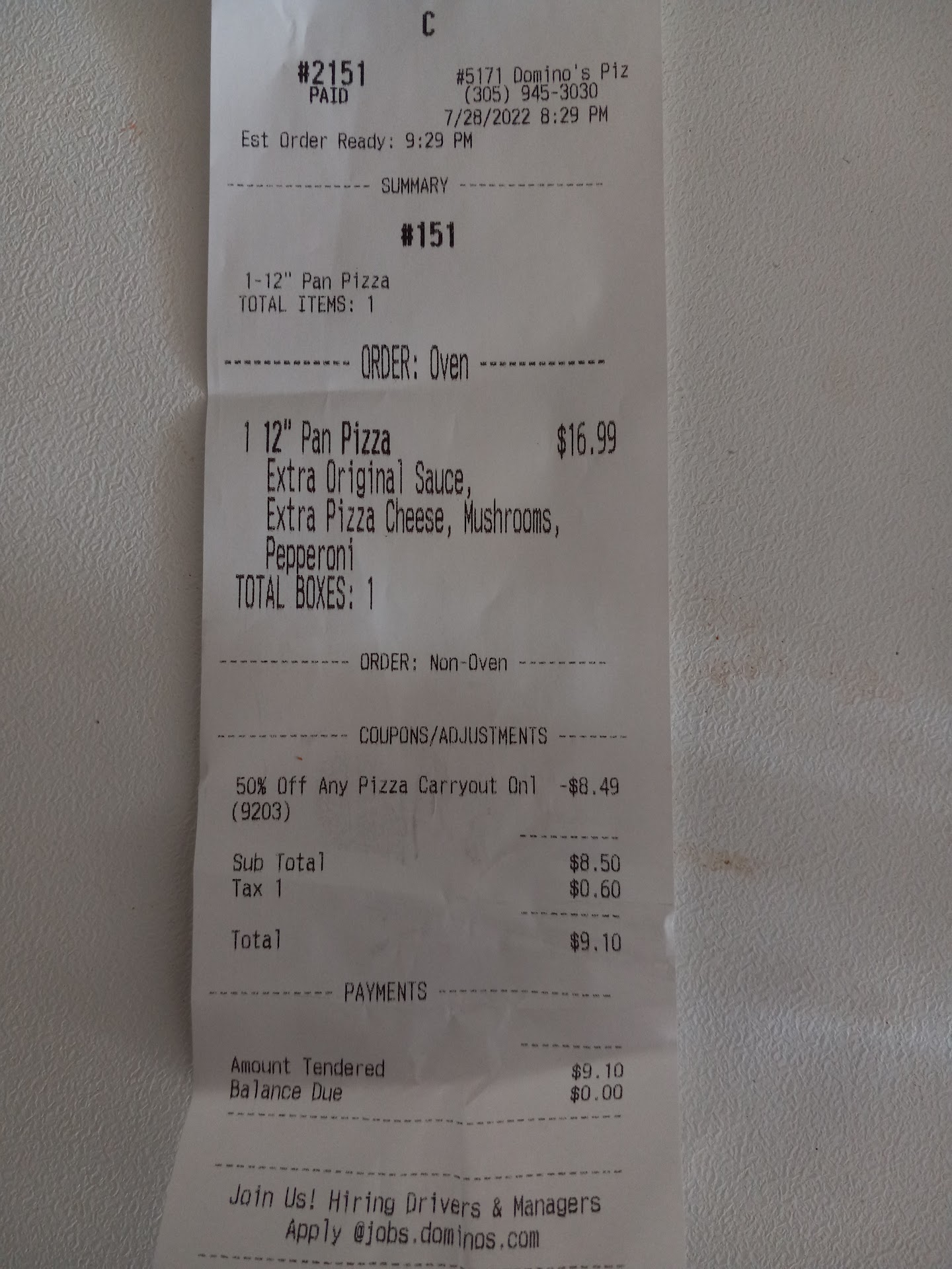 Yesterday I placed an order for a carryout as seen at the receipt I uploaded at 8.29PM, said it would take around 24-34 minutes, ok. I got there 8.50, it was fine, my order was not ready yet, so I waited outside along with another lady who was there before me. I can see on the screen that my name is on 3rd place and said it would take 5-10 minutes. At 9.05 it showed 1-5 minutes, but the strange thing is that my name was bumped down to 4th, then 5th, 6th instead of getting closer to the first place. It's 9.10, Asked about my order, explained that it was over 40 minutes that my order was placed in the front desk guy said "it's not ready yet, we are understaffed" (there was 4-6 people around working) like if he was a robot, and didn't care, not even an apology". It's almost 9.20pm so I talked to a different employee, explained what was happening, she looked at me with that look that you see when a little kid knows he messed up and said to me "I'll take care of you" she immediately went to talk and asked the guy who makes pizza to start doing mine, can you believe it? If it wasn't because I ASKED again, I would've been waiting even longer for them so START my order. Not even an apology again. I went out of there at 9.29PM as you can check on the receipt, that's 1hour from receiving the order to actually have it done, you could actually win a new world Guinness record for longest time receiving a pizza order and finishing it, congratulations 🎊. A couple of honorable mentions: