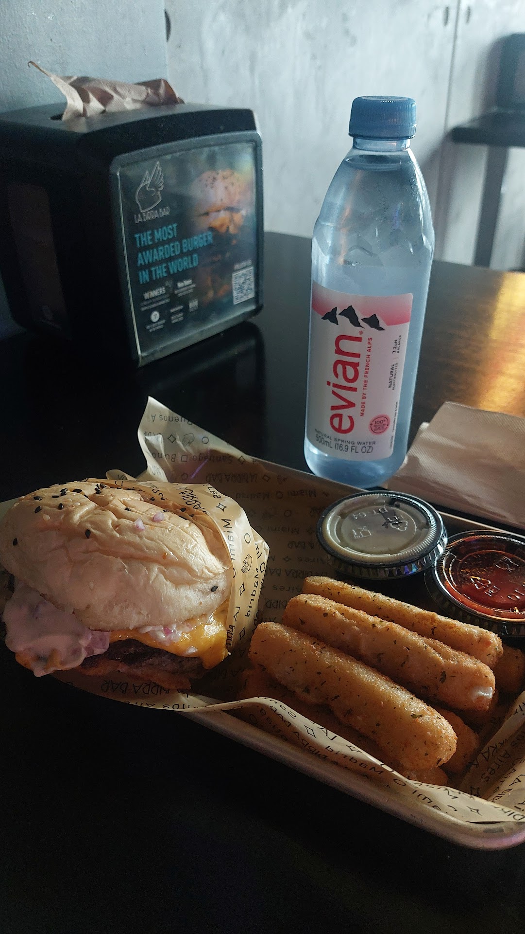 Read moreOverrated, over priced, and over hyped. Kind of upset and didn't enjoy $30 worth of food for three little things. They mention fresh buns prepared there, as wells as the smash style burger patties with a secret mayo and diced red onions. I'm a big cheese head and saw some golden brown cheese sticks that looked good so I figured let me check out if some tasty Argentinean cheese or seasoning is used on these but in the end, I've had way better burgers and cheese sticks and bummer to get charged for a water bottle when lady in front of me got a cup of water for free so I felt takem advantage and paying more money for unsatisfying food. I saw service walking around and attending some others before I say to eat and while I waited for my buzzer to ring to alarm that the food is ready. I even tipped at the register hoping for this extra service to attend and get some refill or anything missing but instead never got approached, I had my buzzer ring and I had to get up and go get the food, I got up to get extra sauce packets and when I finished I got up to give my tray to server so again these are the experiences where I feel why did I tip when I got no additional service. Pretty bummer, burger was all right like a 7.2 out of 10. Sticks weren't better, not golden brown like other images I saw. I rate those like 6.2 out of 10 and would've had better mozz sticks cooked from frozen at home. Mayo churri sauce was good and nice interior but back was also hurting from the stools with no backs so a bit uncomfortable and had to put my back against the wall to help ease pain a little since I didn't want to move tables and "dirty or use" another one. Wouldn't return and I was excited after seeing worlds most awarded burger but meh Ive definitely had better...