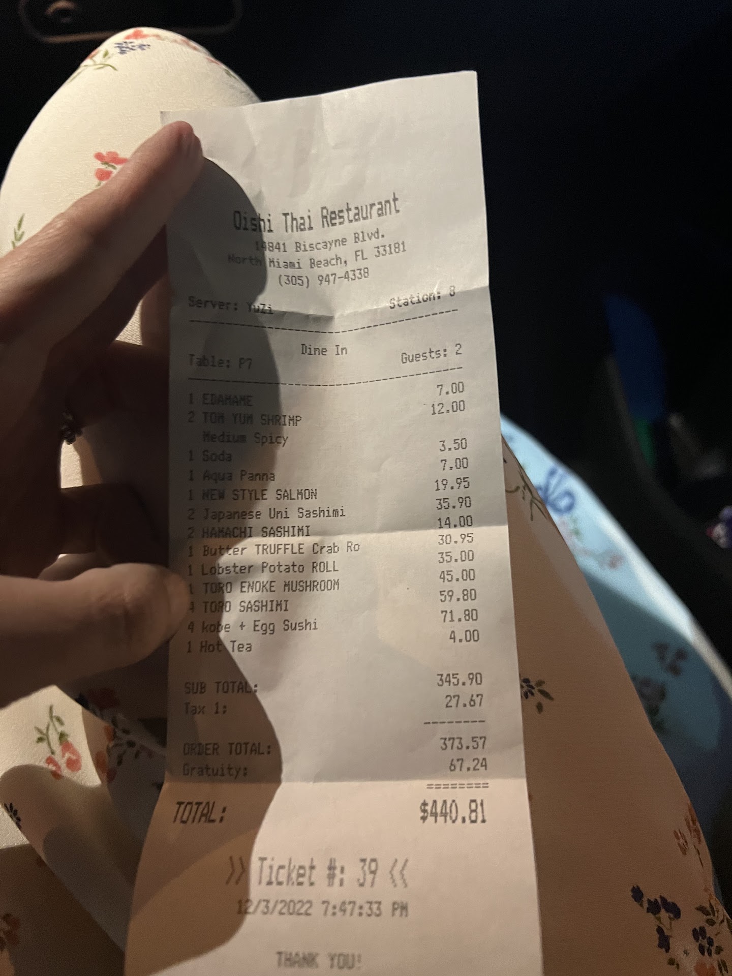 Read moreServer not too friendly keeps coming every minute asking if we are going to drink something, I didn't feel welcome, not friendly attitude sensed from server. Smile and be nice doesn't hurt, but maybe his culture doesn't know that. I was trying to converse with my partner, restaurant was empty and all of a sudden a couple enter the restaurant and manager welcome these people like they were the owners... So loud and annoying for about 5 minutes, so rude in front of seated guests... manager has no idea on how to make feel customers welcome and kept having them back. Then dragon roll sushi came, I give it 5/10, order also a tom kha soup, chicken was disgusting and had no flavor whatsoever , actually tasted old... soup was flavorless... 3/10 Then a female waitress came to save the night, very nice and proper. No wonder there was no one dining there when I got there 8:30pm... Restaurant completely empty, I should have read that sign. Don't waste your time and money here, any other Thai restaurant is...