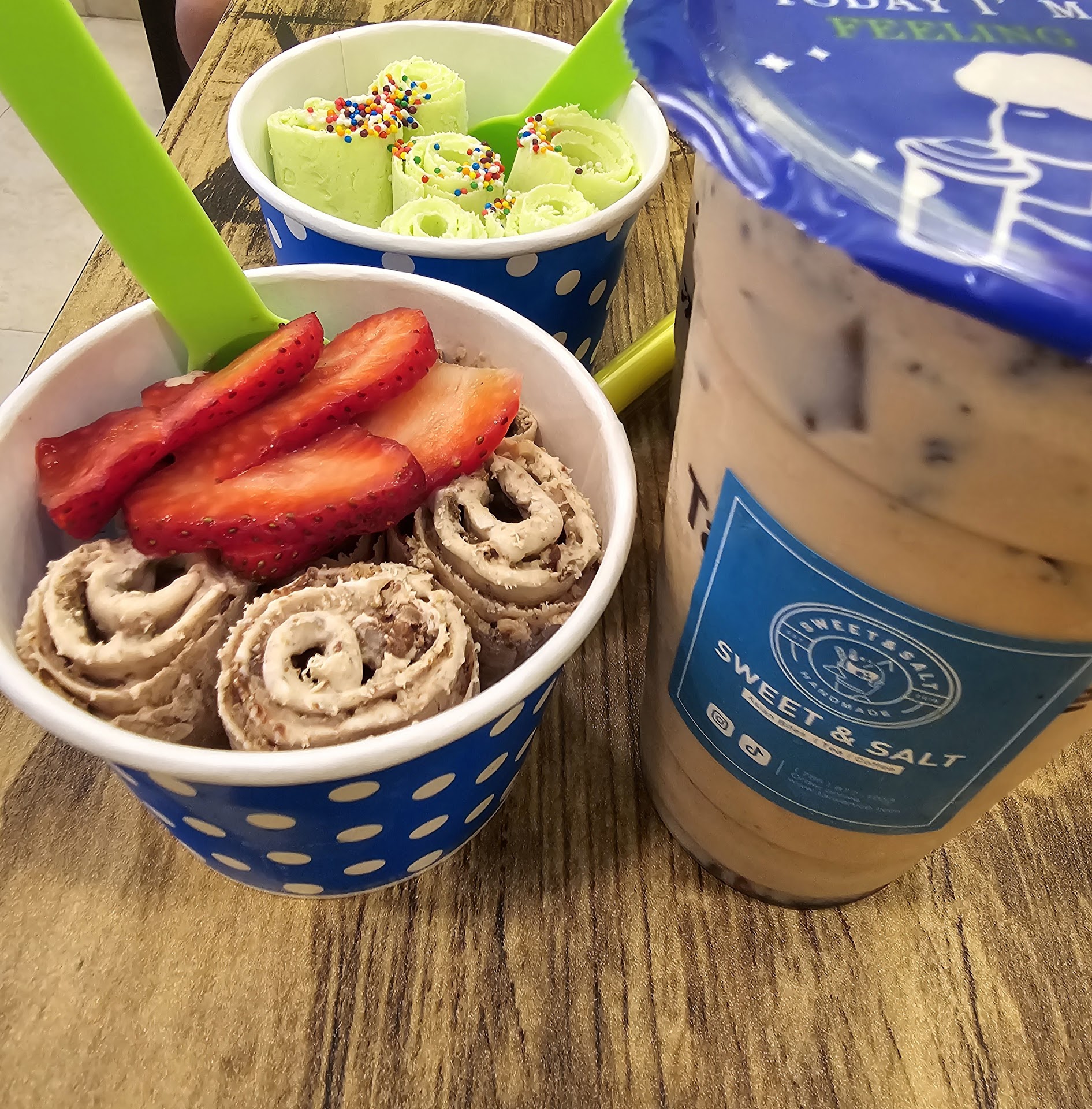 ย ย ย Read moreSome of the best rolled ice cream. I was sad for a while because I thought Taiwan Ice went out of business, but I saw the banner for this place while we headed to lunch at Al Chile Taco Bar. I think it's about the same size as the other place where they used to be, but now they are called Sweet and Salt. We had a big group, so we may have overwhelmed them a bit with our orders. We ordered 2 chocolate snow ice creams, which turned out to be huge for our young kids (looked like about 2 cups worth...oops). The 4 out of 6 adults got the rolled ice cream. Flavors ordered: cookies n cream, vanilla, chocolate, and honeydew. We placed the order through the touchscreen kiosks next to the entrance. All ice creams were labeled at the top, and you easily picked your flavor of ice cream, mix-ins, toppings, additional toppings, etc. I love chocolate and got an assortment of mix-ins (which might've confused the worker) - coconut flakes, Nutella, and reese's peanut butter cups. For topping, I just got fresh strawberry. It was soo good! My husband ordered the honeydew with sprinkles, and it tasted yummy and light. It was very refreshing - I never tried it before, so I was surprised. We, also, ordered the potted plant milk tea. I think it was just thai tea with some oreo cookie crumbles. It was tasty, too. Would love to come back and try their crepes and...
