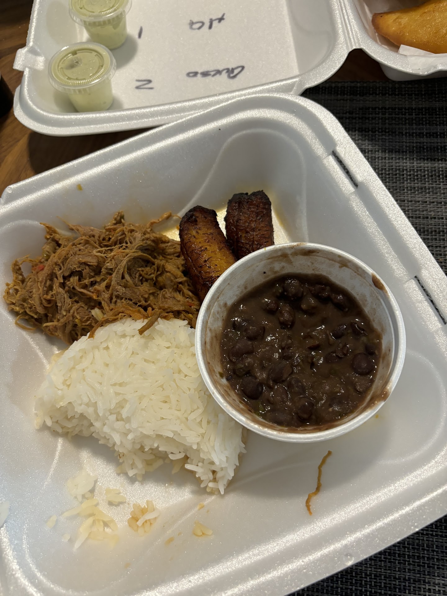 Read moreI've eaten the Pabellon Criollo Lunch two times in one week and it's delicious, sorry for the half-eaten food photo but I forgot to snap it immediately. Pabellon Criollo is a Venezualan national dish and it's a tender, shredded and seasoned beef. The Lunch comes with white rice, beans and plantains. The plantains are beautifully caramelized too, I will never make them this good myself. Empanadas are the deep-fried type, I've ordered the cheese ones three times. We've also tried three different arepa sandwiches, all were great. My son got the beefsteak special that comes with a few red caramelized onions, with fries and rice. Thumbs up! He has a peanut and tree nut allergy and it has been suitable, which is great! For dessert (for my spouse and me, not my son) we ordered the bienmesabe cake (the square one in the photo) and the tres leches cakes. Overall excellent home-style cooking and friendly service. We've also had the perico breakfast that came with an arepa instead of toast. Excellent! I'm a complete convert to Venezualan food now! This is a...